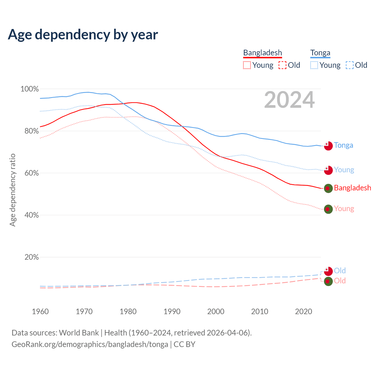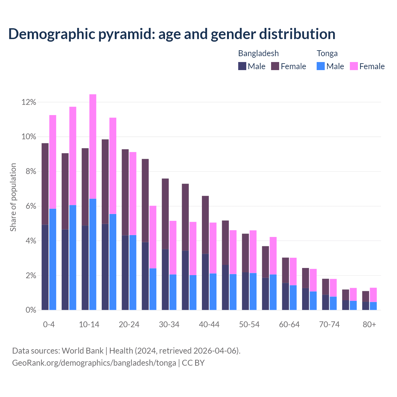 - Bangladesh is ranked 124/196 by median age (oldest to youngest) vs 149/196 for Tonga.
