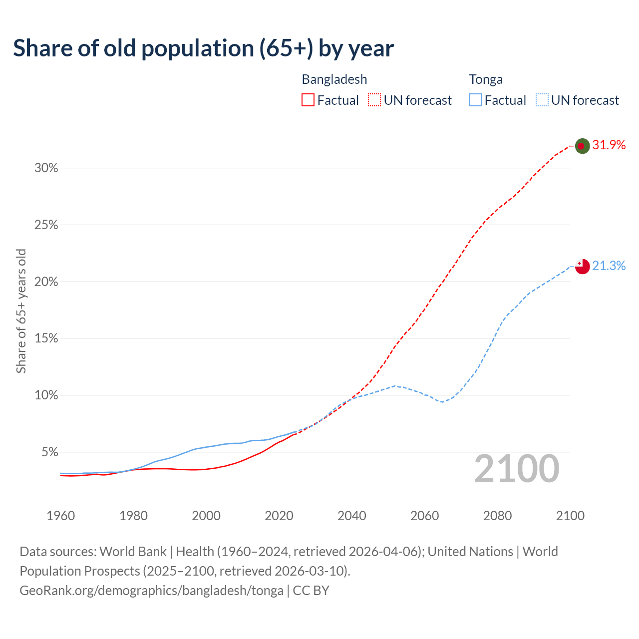 The share of older people aged 65 and over is 6.5% in Bangladesh and 6.72% in Tonga. Life expectancy in Bangladesh compared to Tonga .