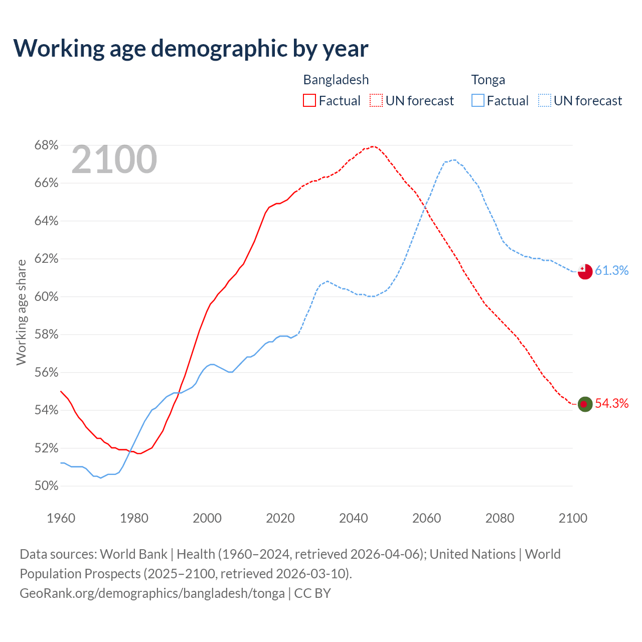 - Bangladesh has 117M working age adults (aged 15-64) vs 59.8K in Tonga.