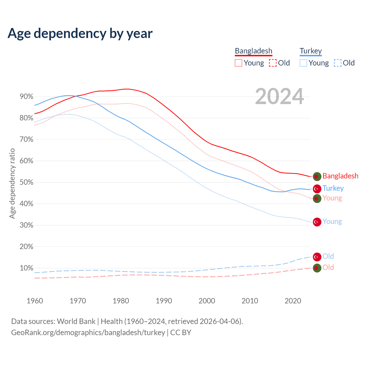 - Bangladesh is ranked 124/196 by median age (oldest to youngest) vs 83/196 for Turkey.