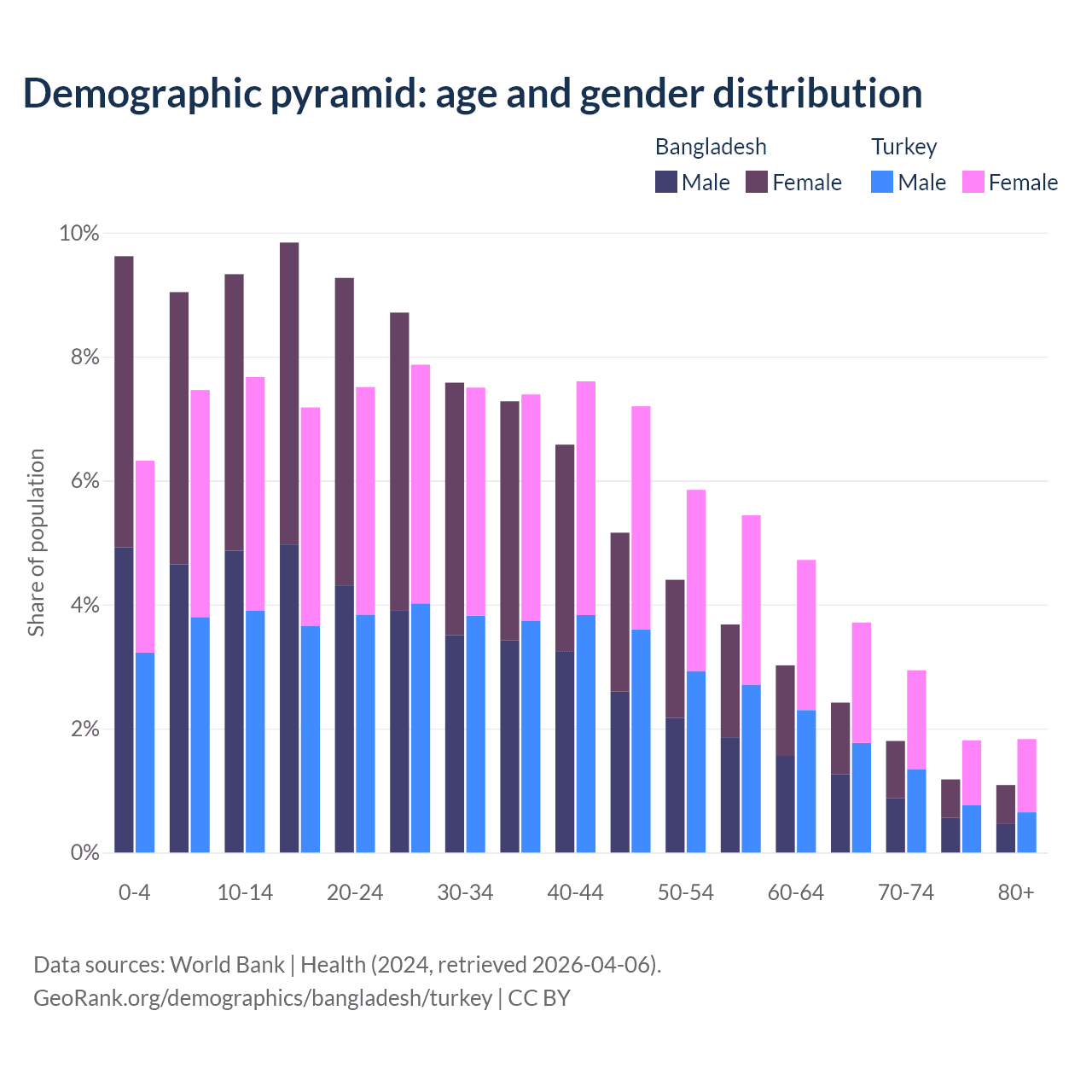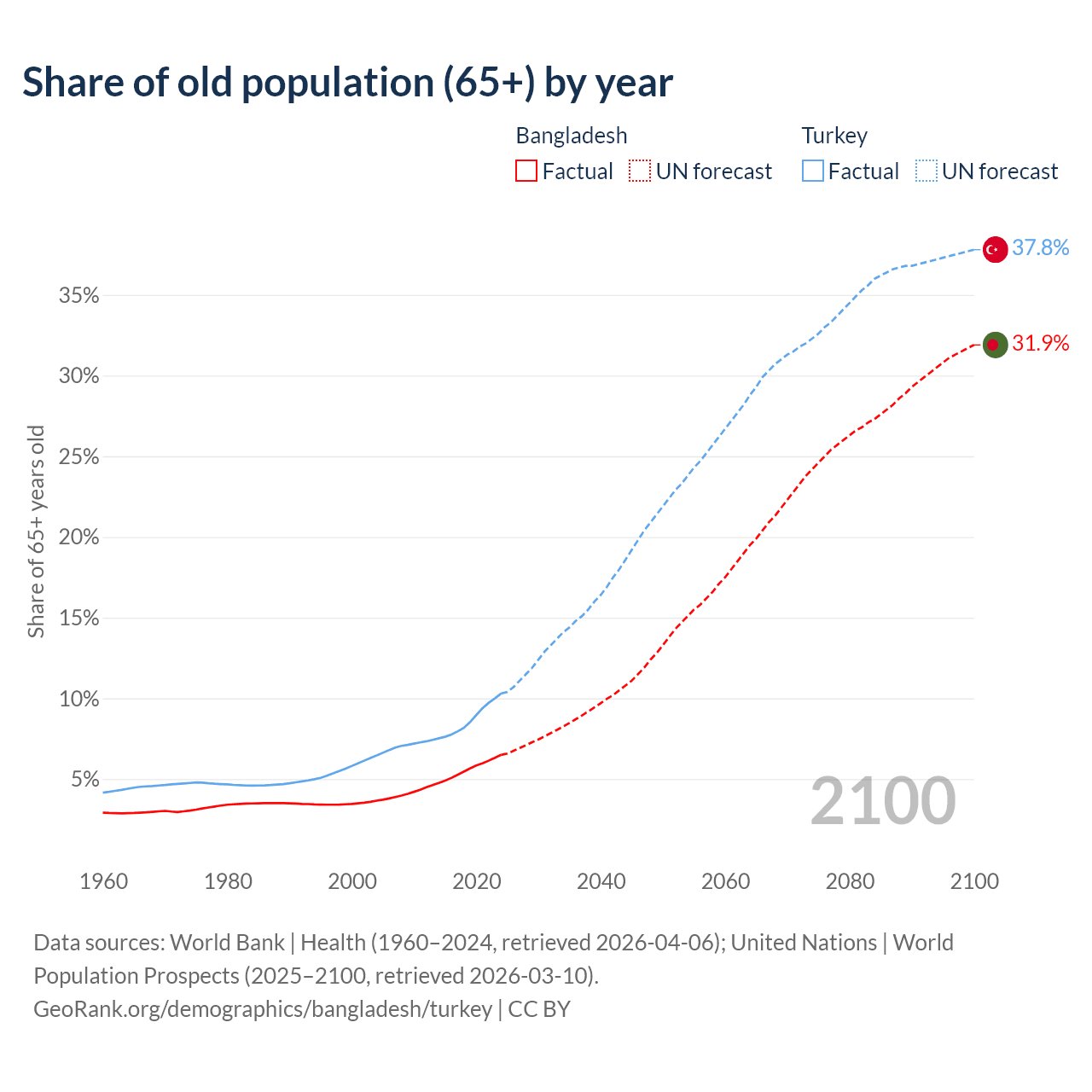 The share of older people aged 65 and over is 6.5% in Bangladesh and 10.3% in Turkey. Life expectancy in Bangladesh compared to Turkey .