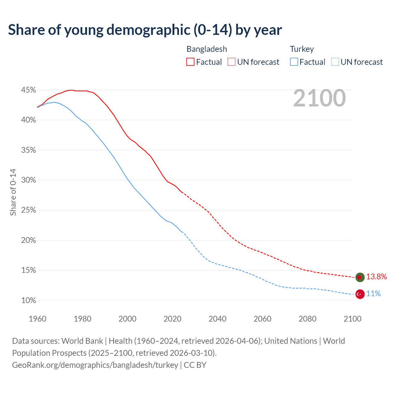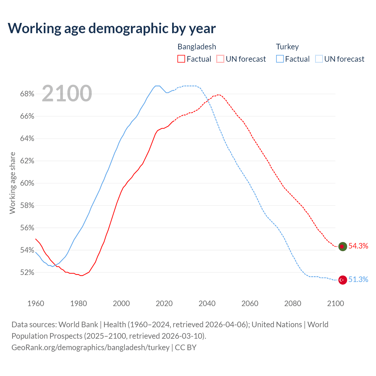Median age Bangladesh vs Turkey, 1960-2100