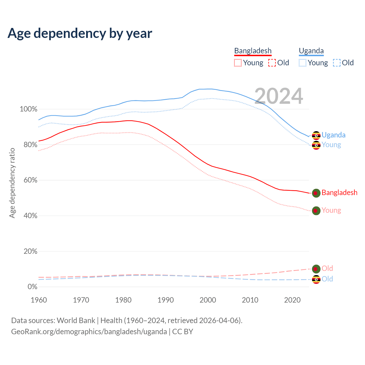 - Bangladesh is ranked 124/196 by median age (oldest to youngest) vs 187/196 for Uganda.