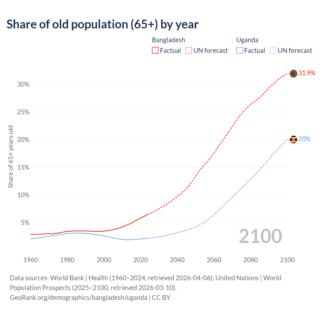 The share of older people aged 65 and over is 6.5% in Bangladesh and 2.19% in Uganda. Life expectancy in Bangladesh compared to Uganda .