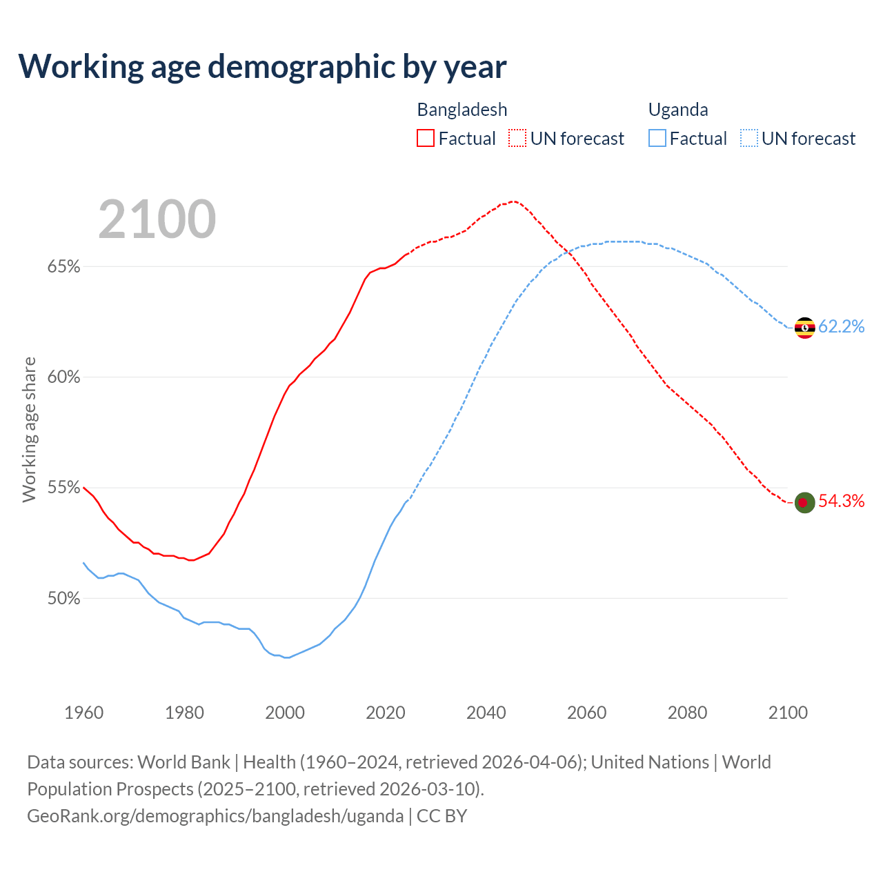 - Bangladesh has 117M working age adults (aged 15-64) vs 28.9M in Uganda.