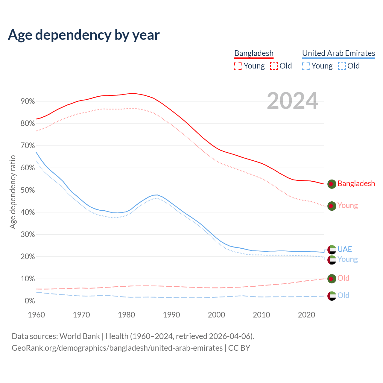 - Bangladesh is ranked 124/196 by median age (oldest to youngest) vs 91/196 for the United Arab Emirates.