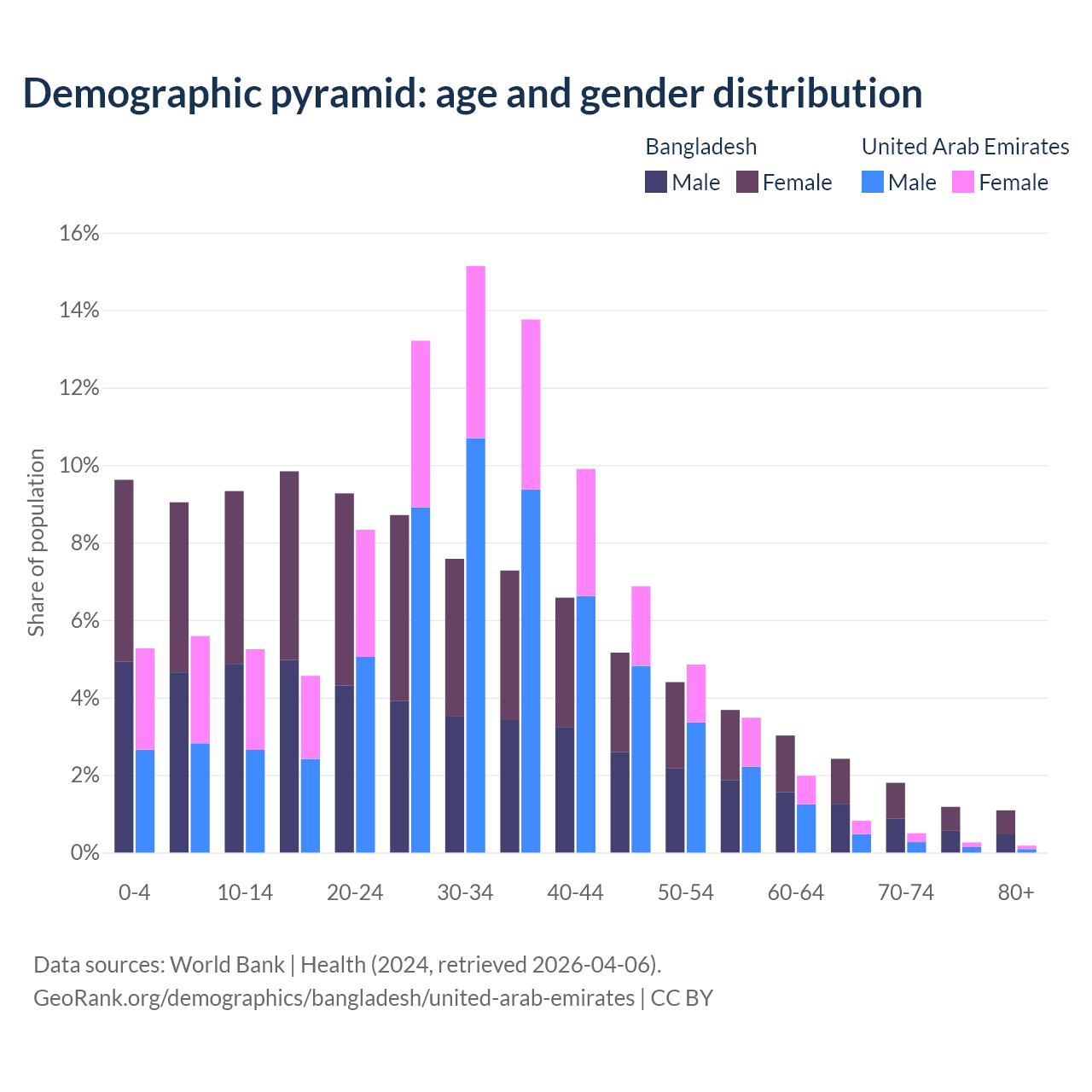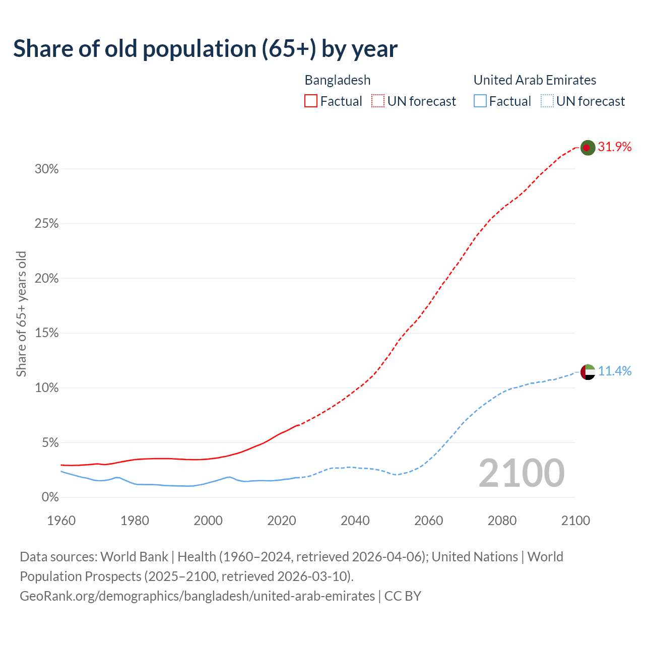 The share of older people aged 65 and over is 6.5% in Bangladesh and 1.77% in the United Arab Emirates. Life expectancy in Bangladesh compared to the United Arab Emirates .