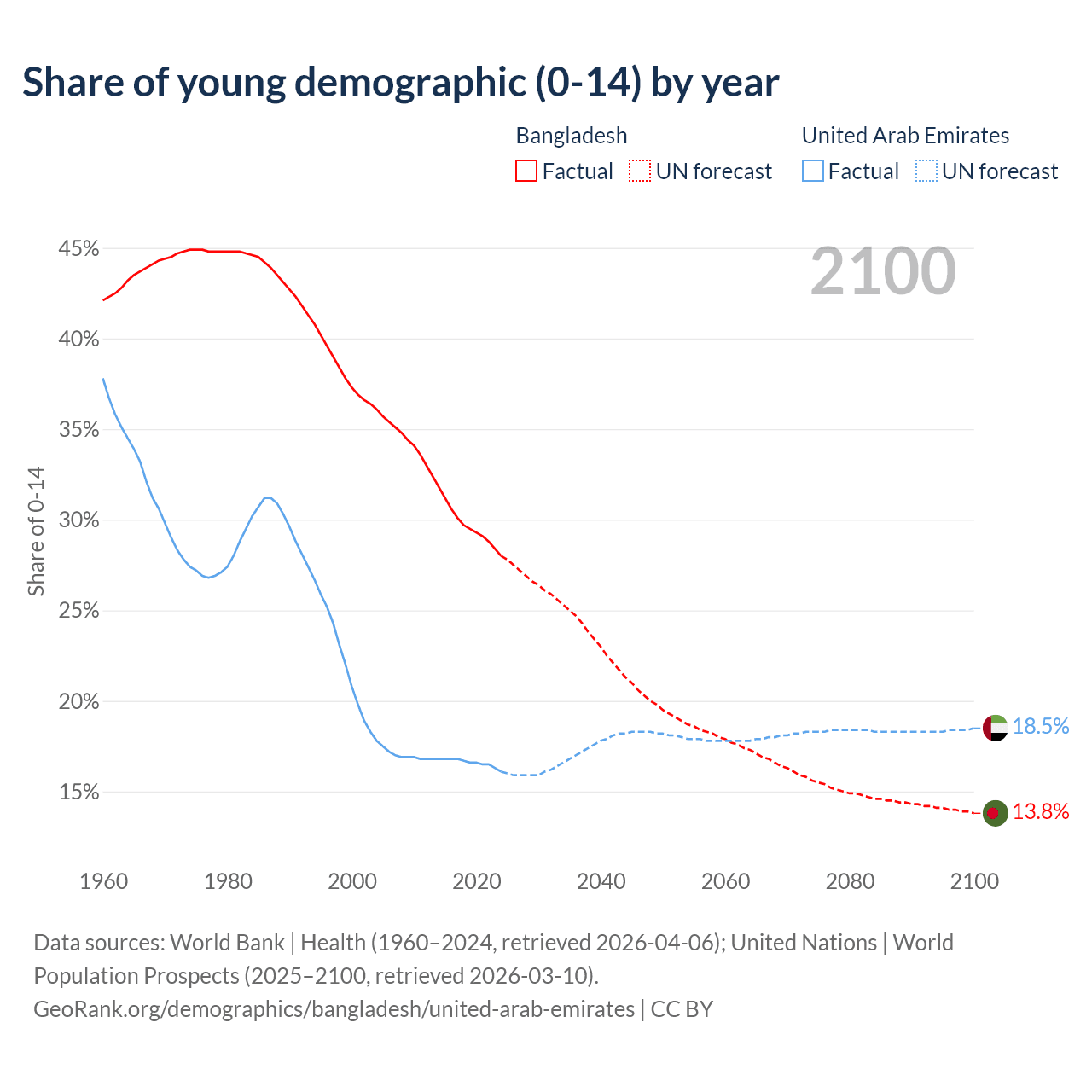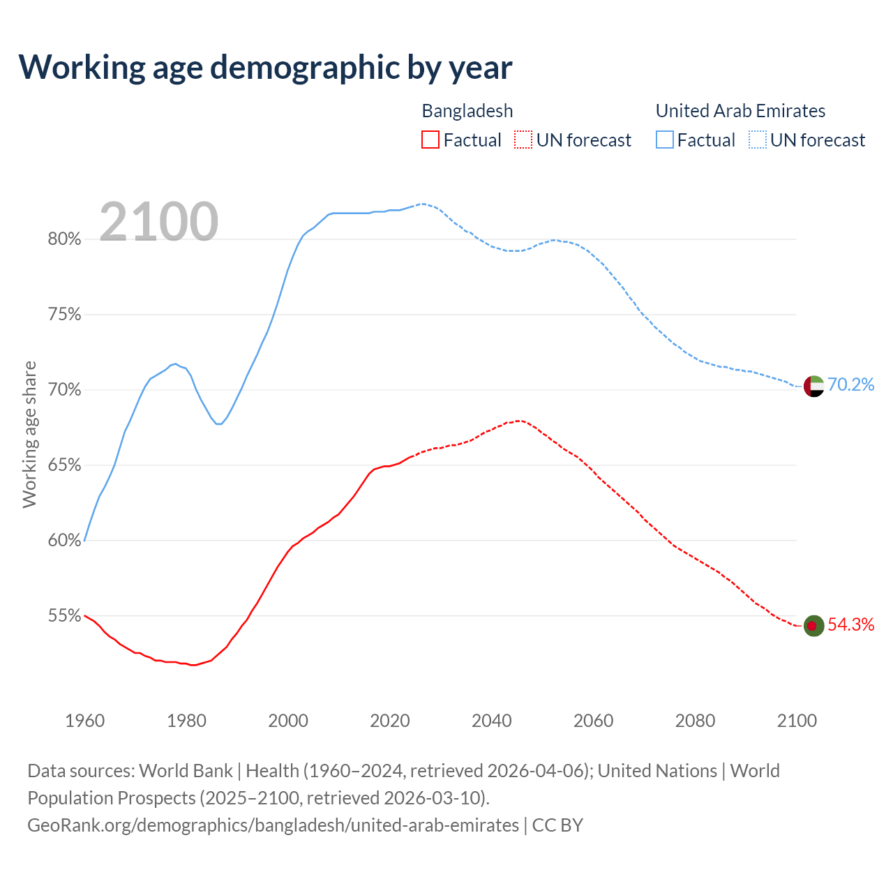 Median age Bangladesh vs United Arab Emirates, 1960-2100