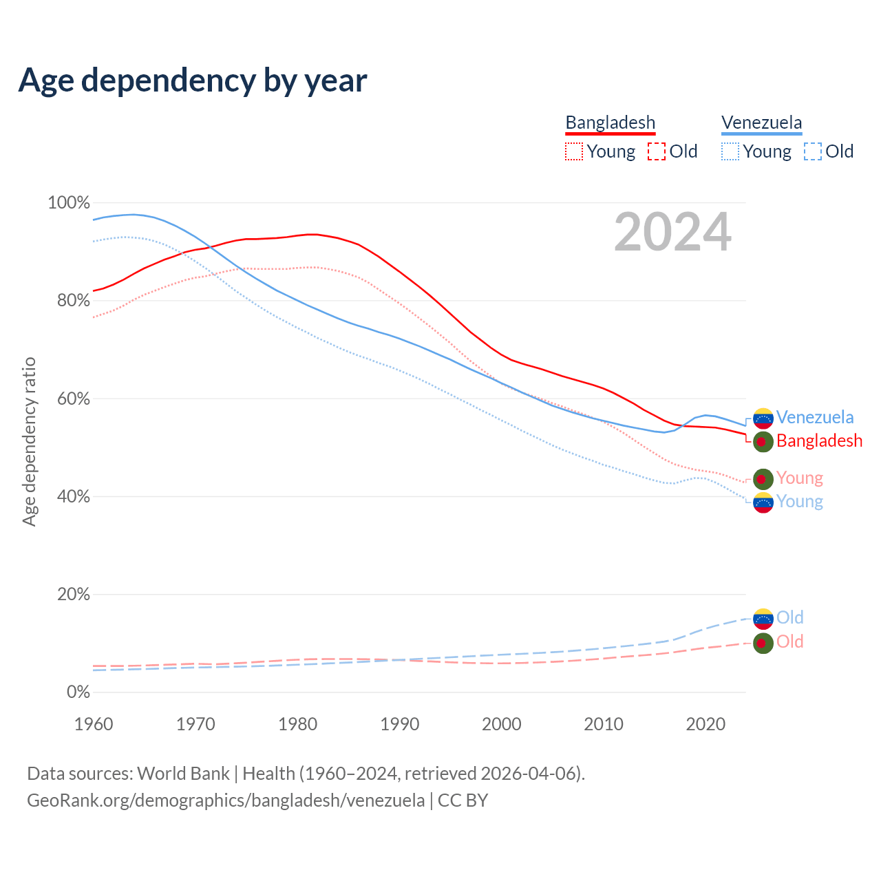Data sources: World Bank | Health (1960–2024, retrieved 2026-04-06); U.S. Census Bureau (1960–2024, retrieved 2026-02-08).