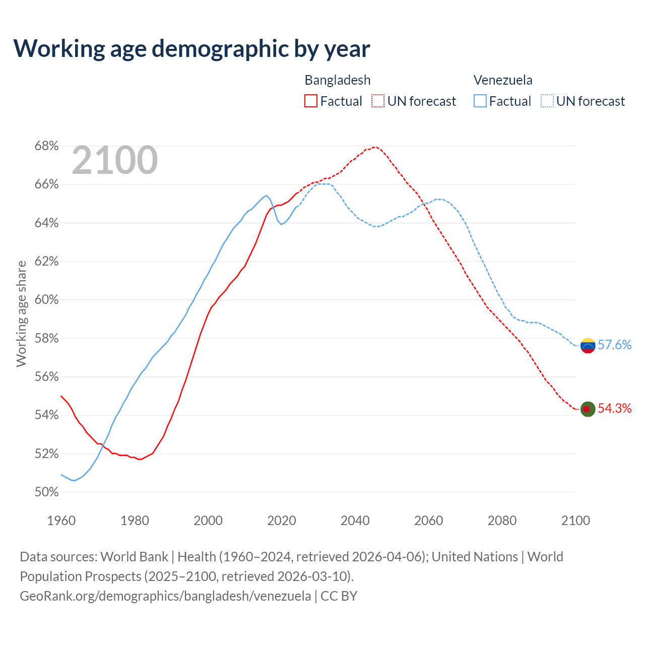 Median age Bangladesh vs Venezuela, 1960-2100