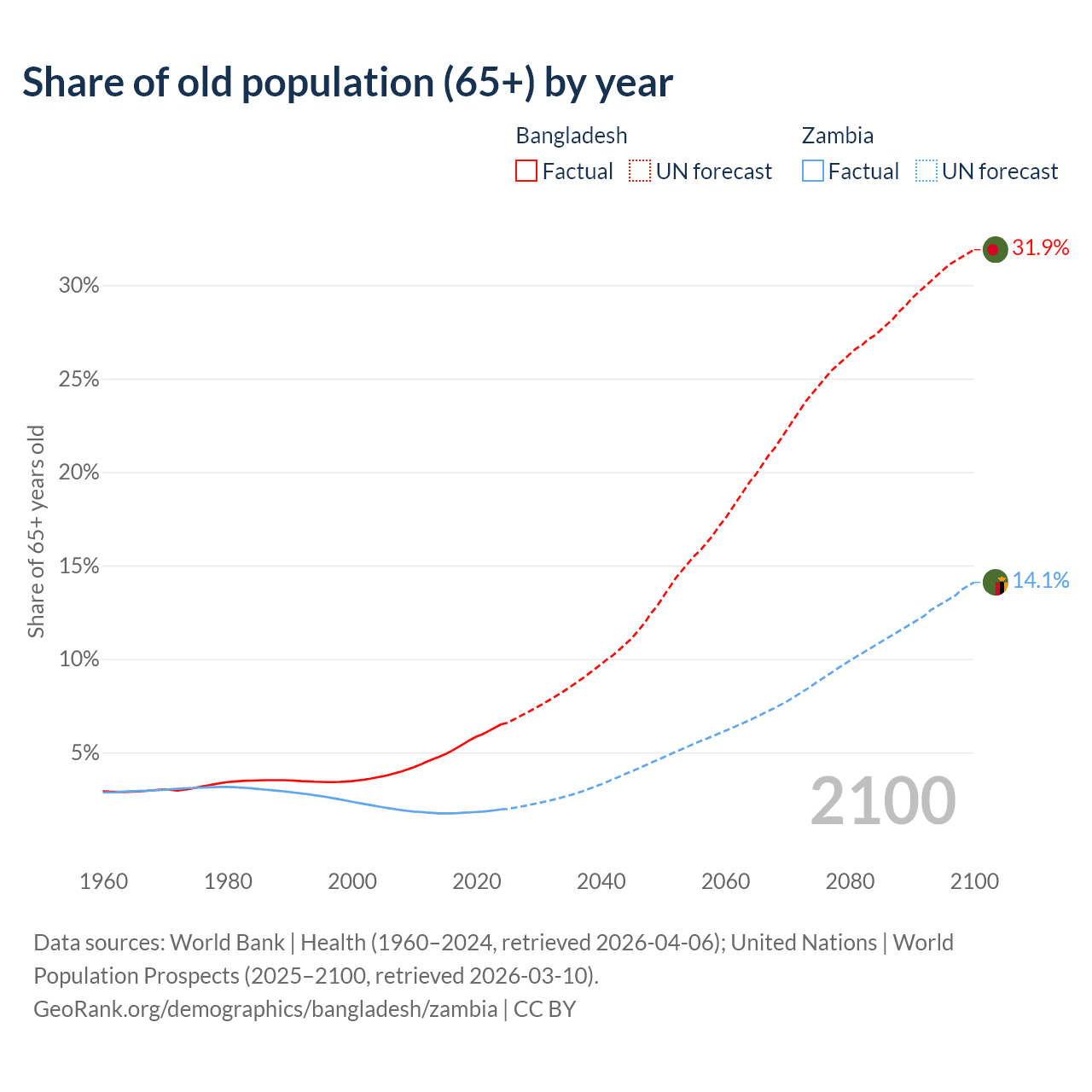 The share of older people aged 65 and over is 6.5% in Bangladesh and 1.95% in Zambia. Life expectancy in Bangladesh compared to Zambia .