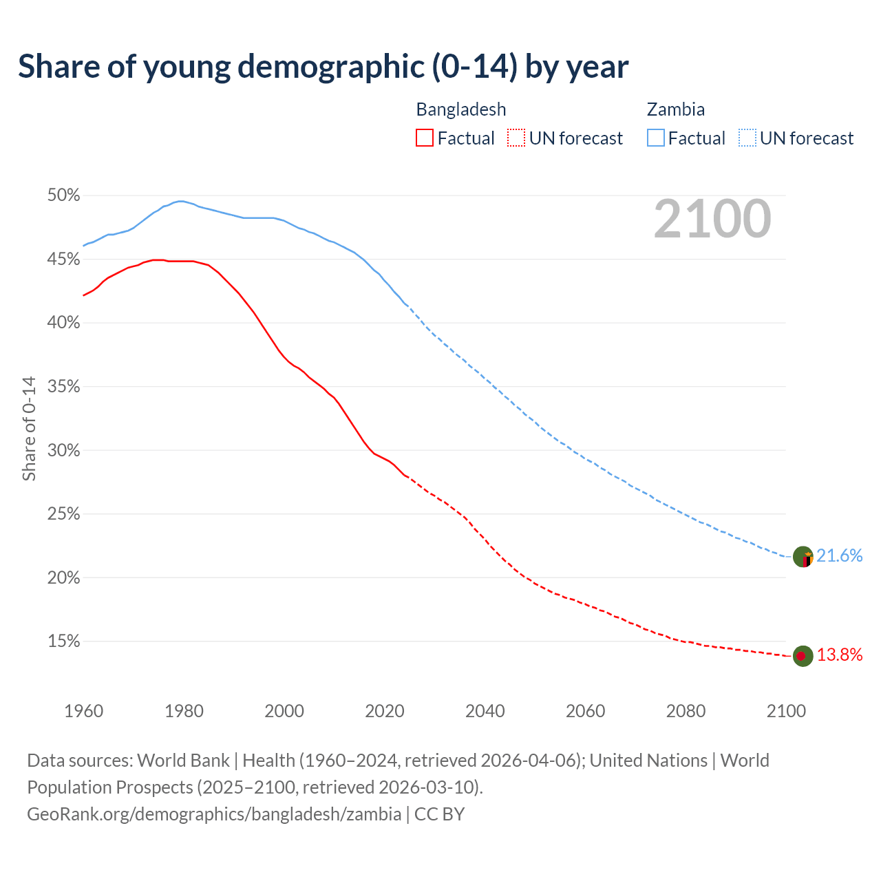 - The share of young demographic (0-15 years old) in Bangladesh is 28% vs 41.5% in Zambia.