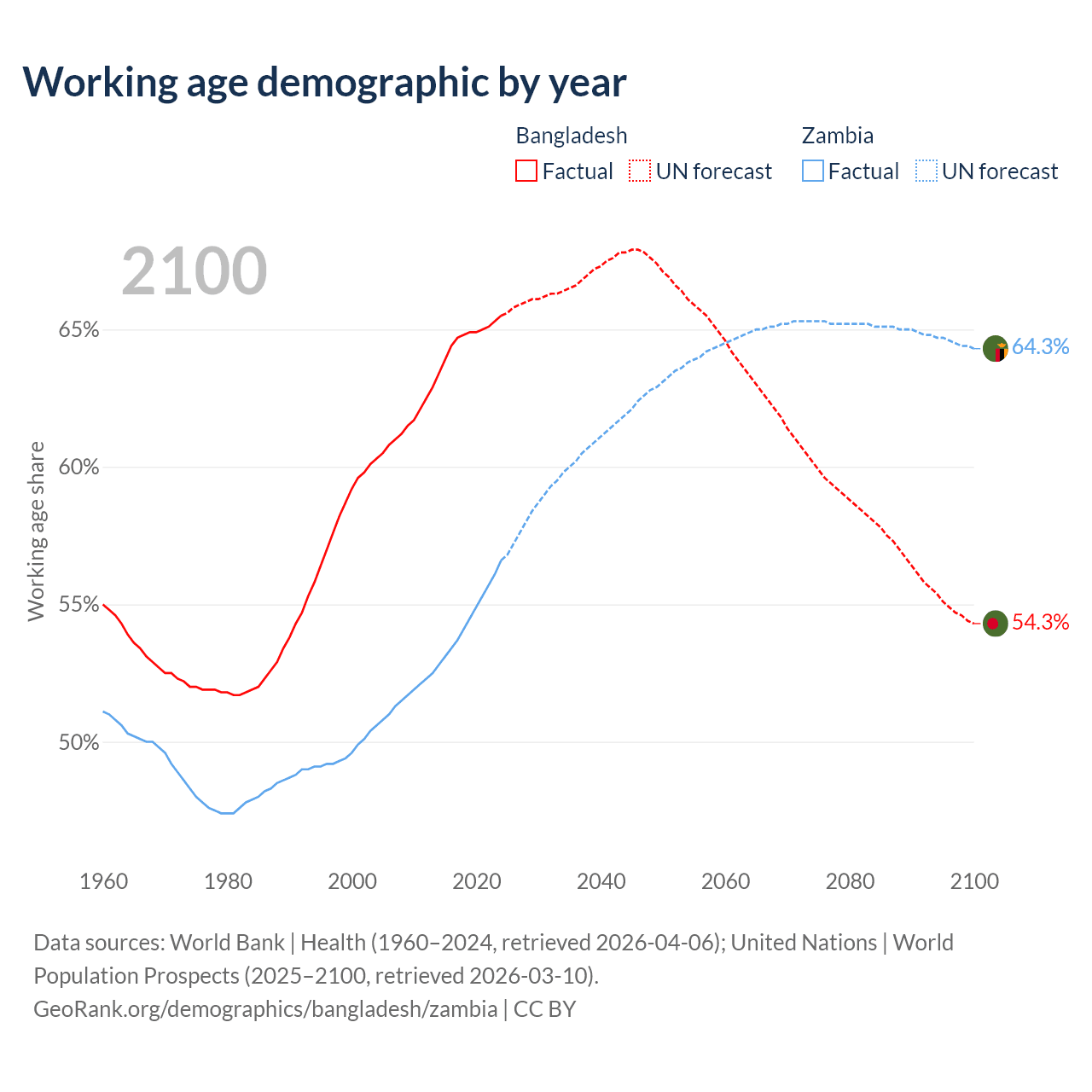 - Bangladesh has 117M working age adults (aged 15-64) vs 12.8M in Zambia.