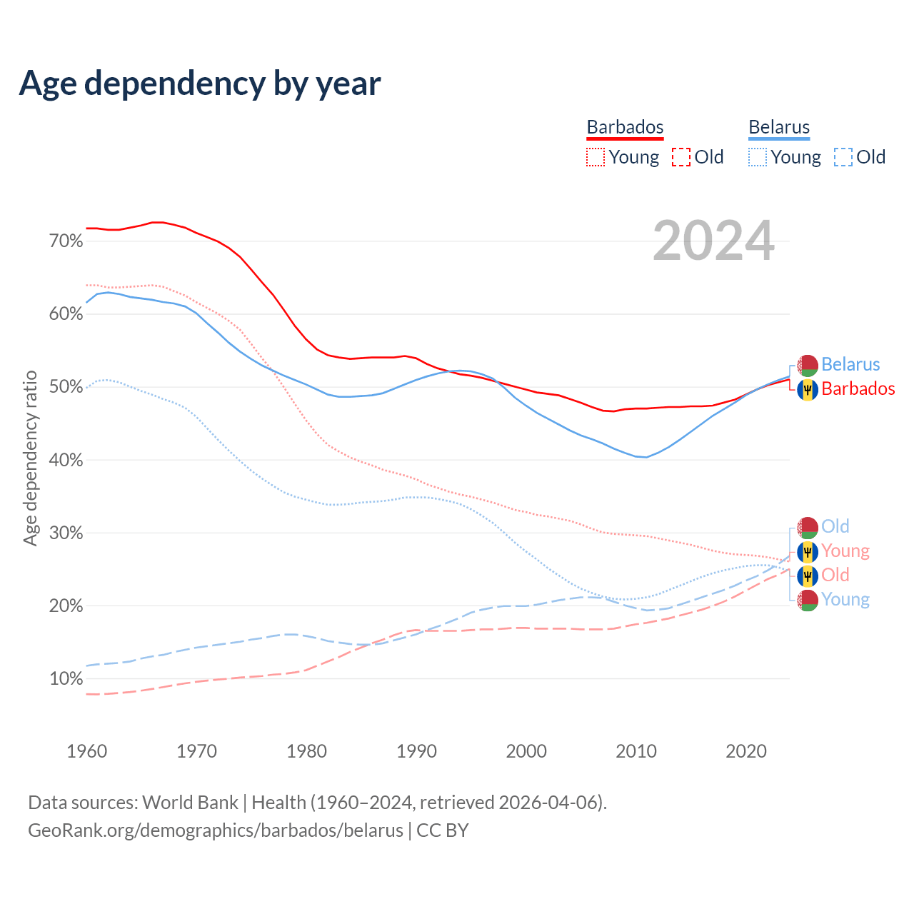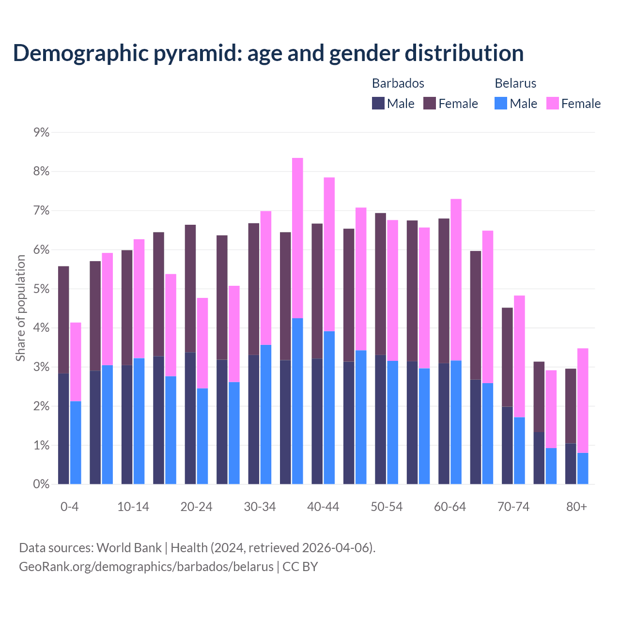 - Barbados is ranked 47/196 by median age (oldest to youngest) vs 35/196 for Belarus.
