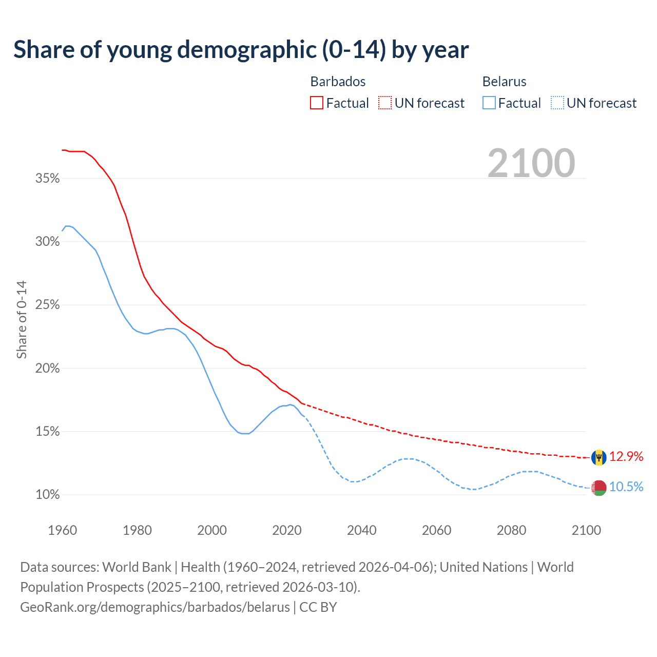 - The share of young demographic (0-15 years old) in Barbados is 17.2% vs 16.3% in Belarus.