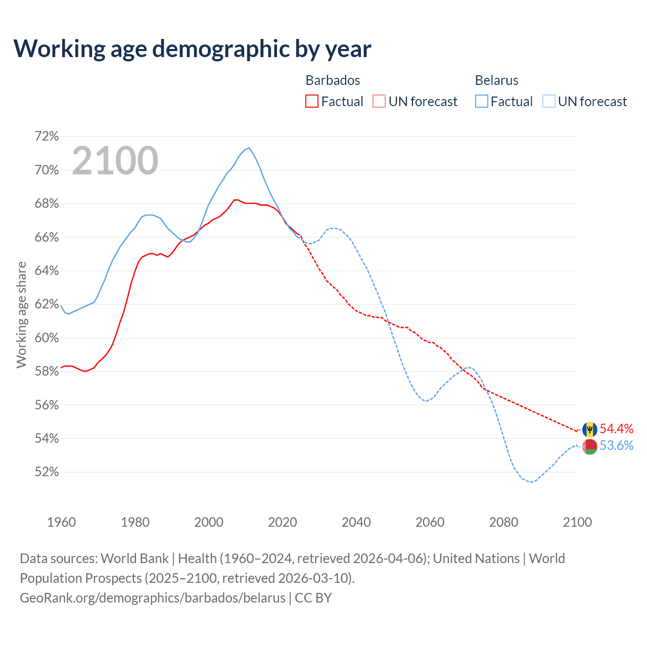 - Barbados has 187K working age adults (aged 15-64) vs 5.95M in Belarus.