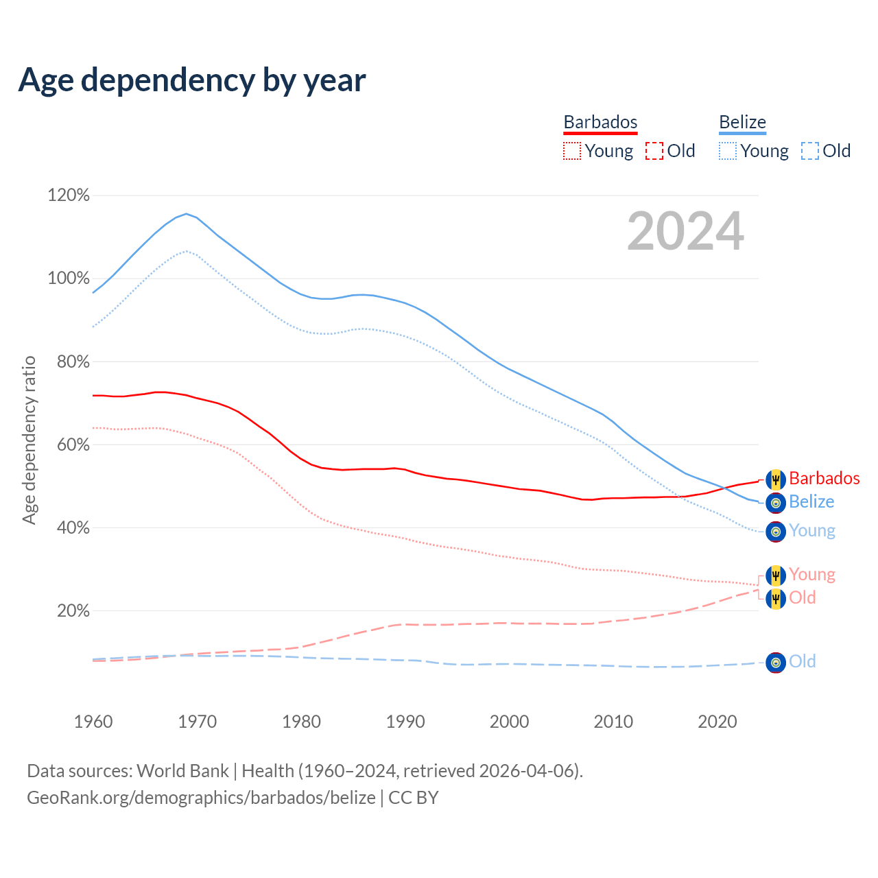 - The share of old-age demographic (65+) in Barbados is 16.6% vs 5.02% in Belize.