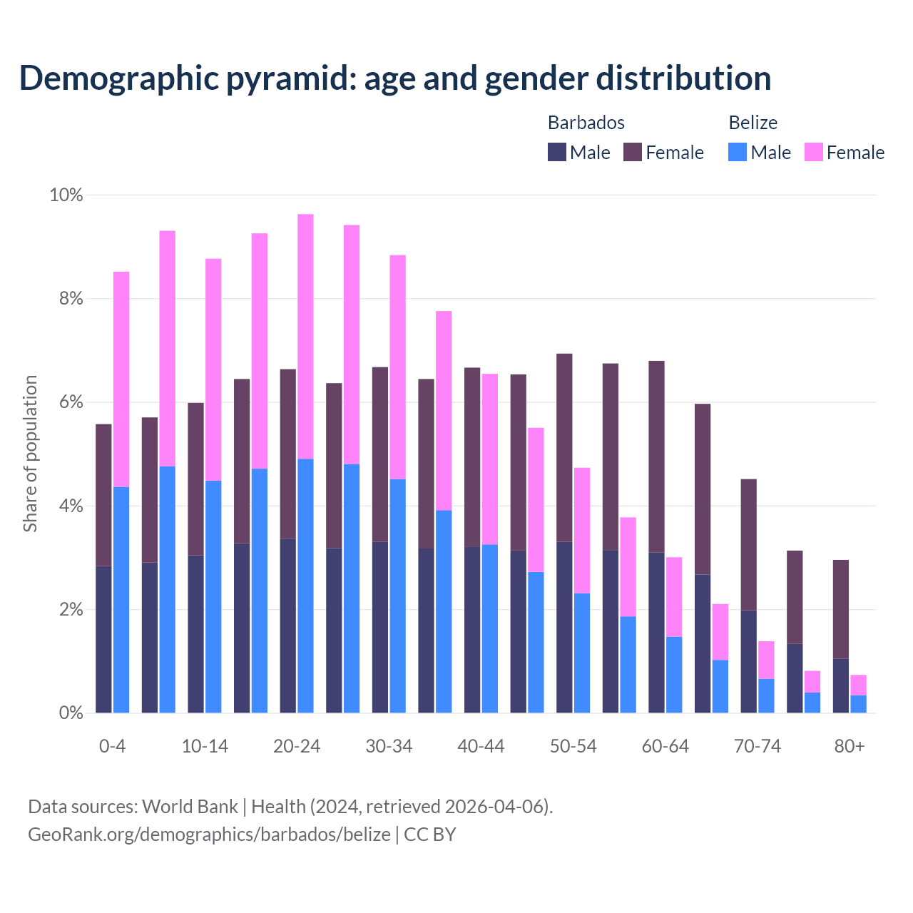 - The share of young demographic (0-15 years old) in Barbados is 17.2% vs 26.6% in Belize.