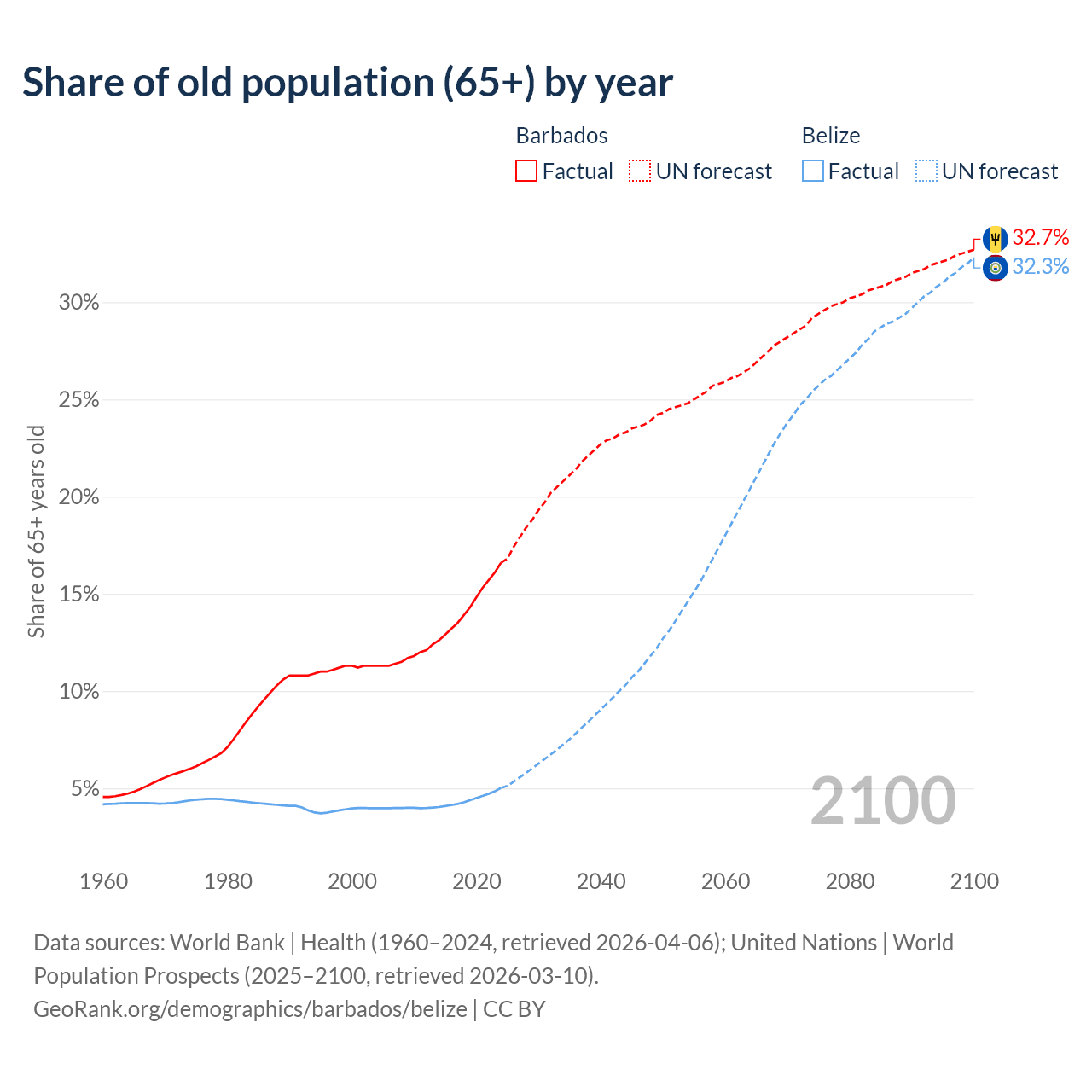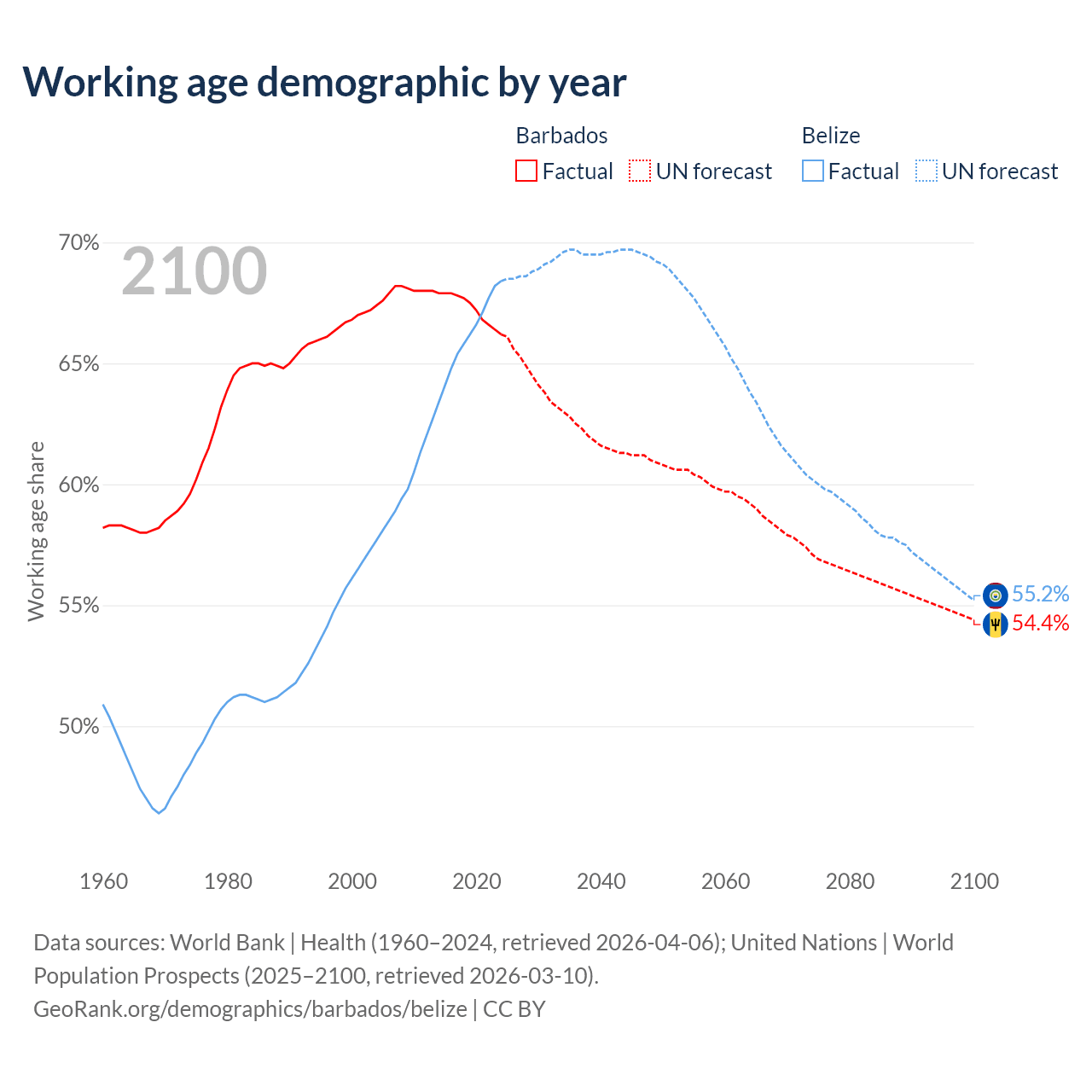 Median age Barbados vs Belize, 1960-2100