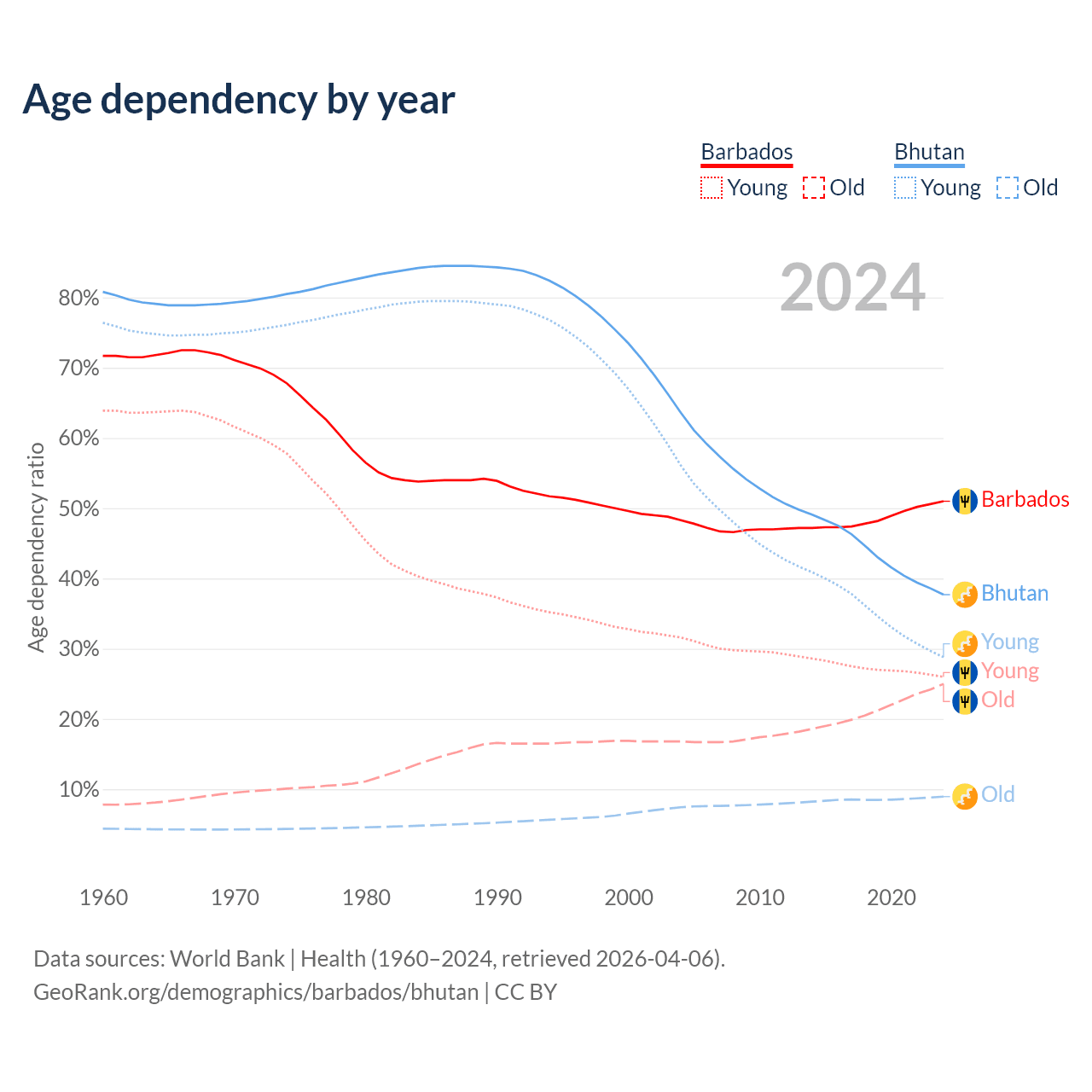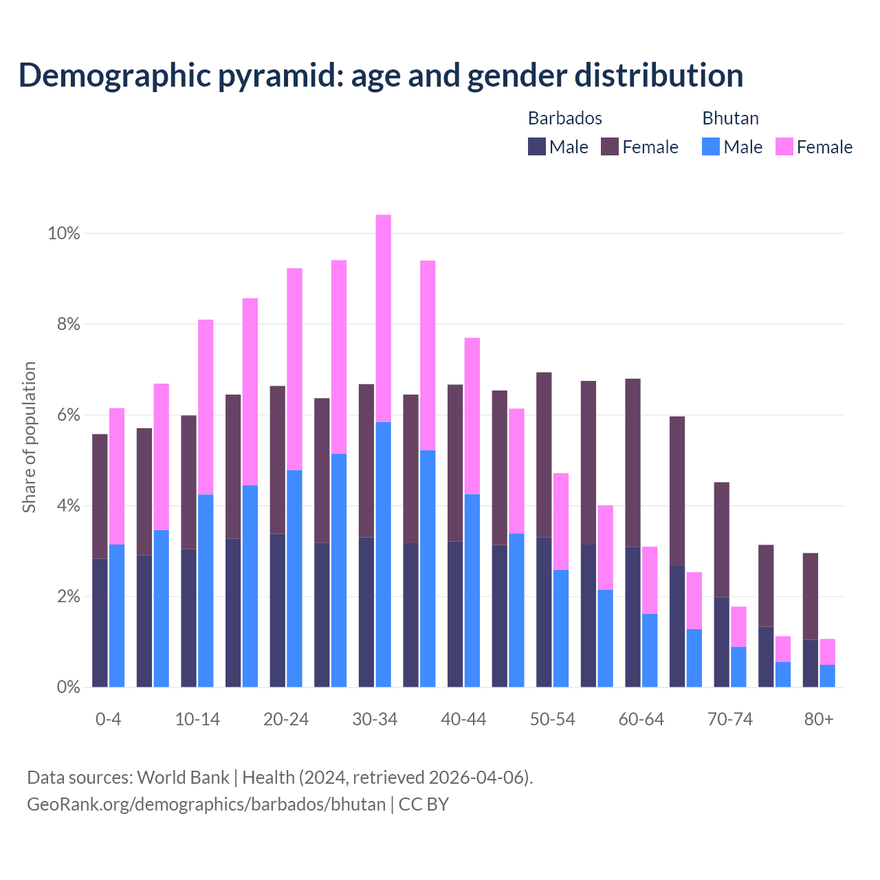 - Barbados is ranked 47/196 by median age (oldest to youngest) vs 95/196 for Bhutan.