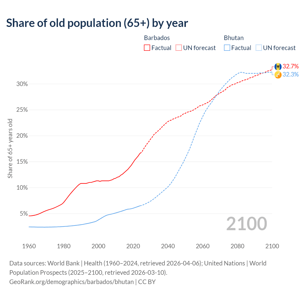 - The share of old-age demographic (65+) in Barbados is 16.6% vs 6.49% in Bhutan.