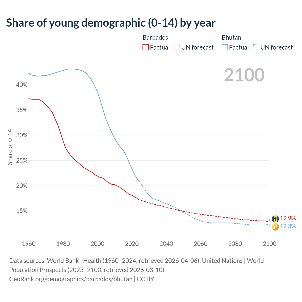 - The share of young demographic (0-15 years old) in Barbados is 17.2% vs 20.9% in Bhutan.