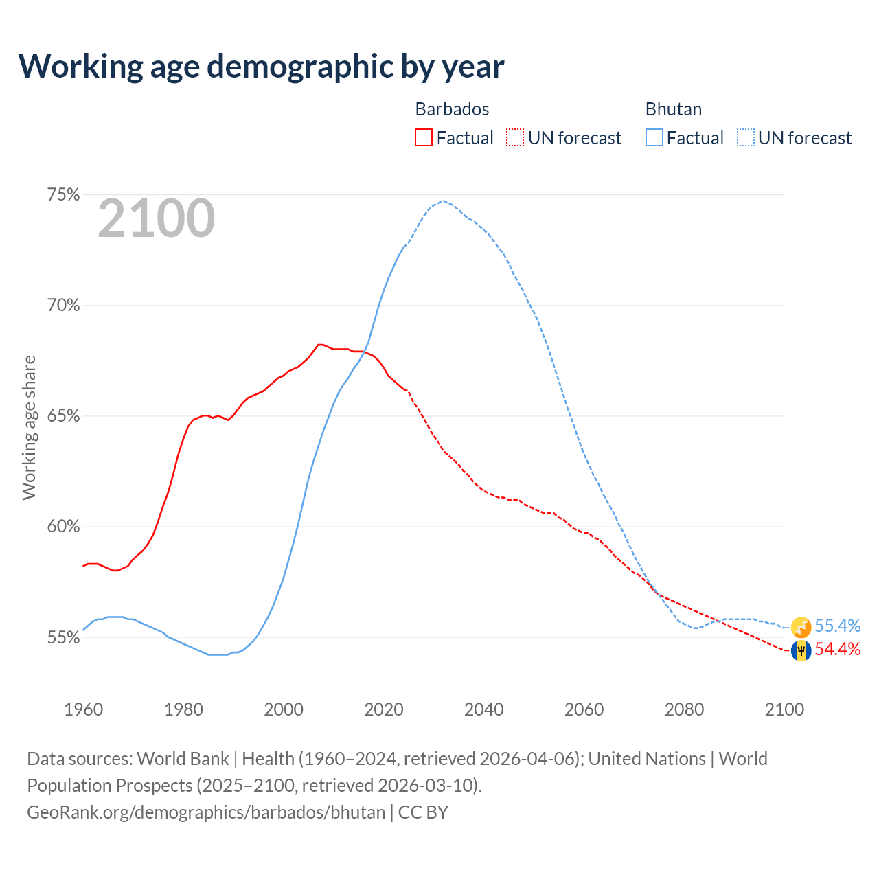 - Barbados has 187K working age adults (aged 15-64) vs 583K in Bhutan.
