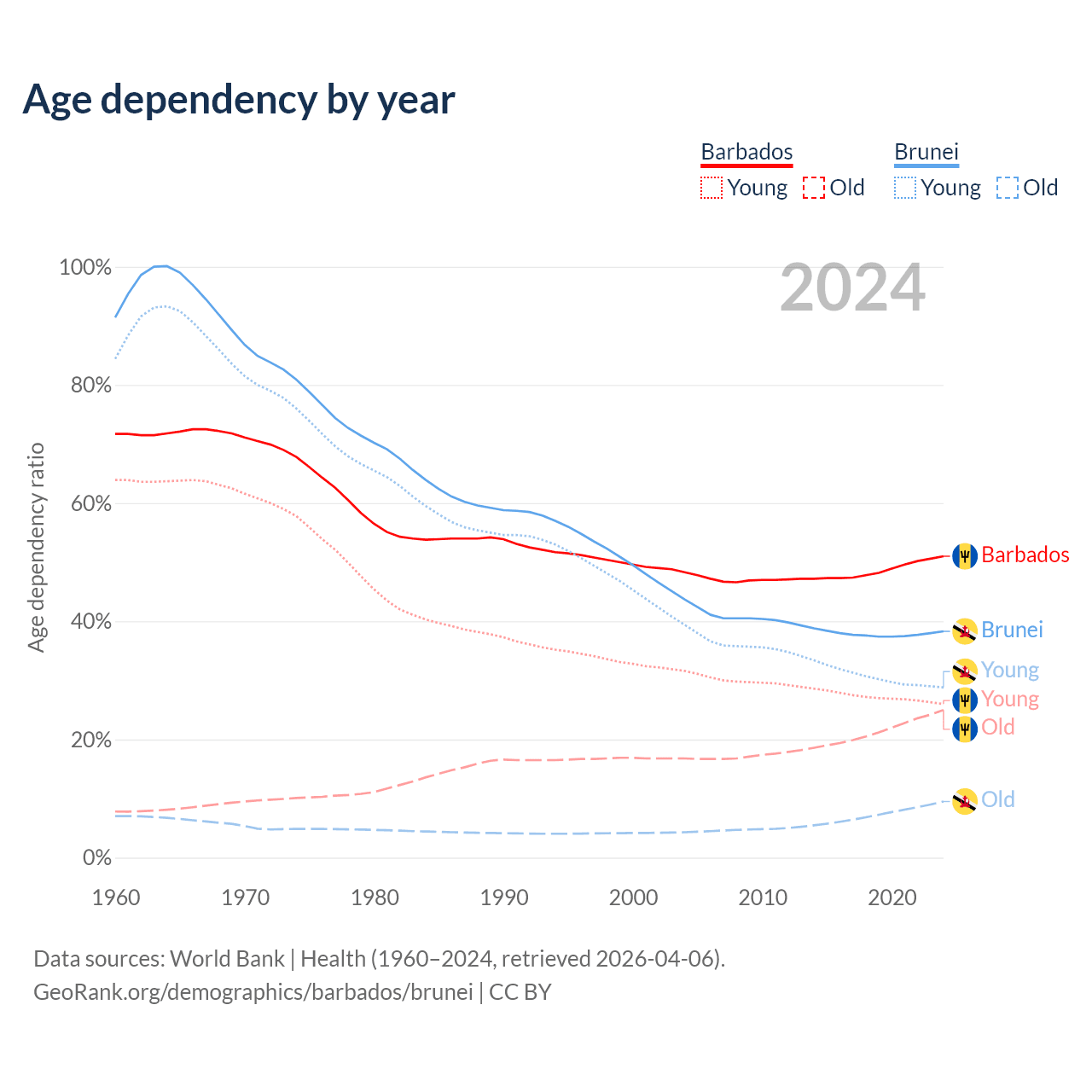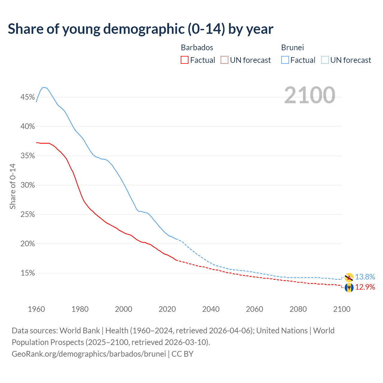 - The share of young demographic (0-15 years old) in Barbados is 17.2% vs 20.8% in Brunei.