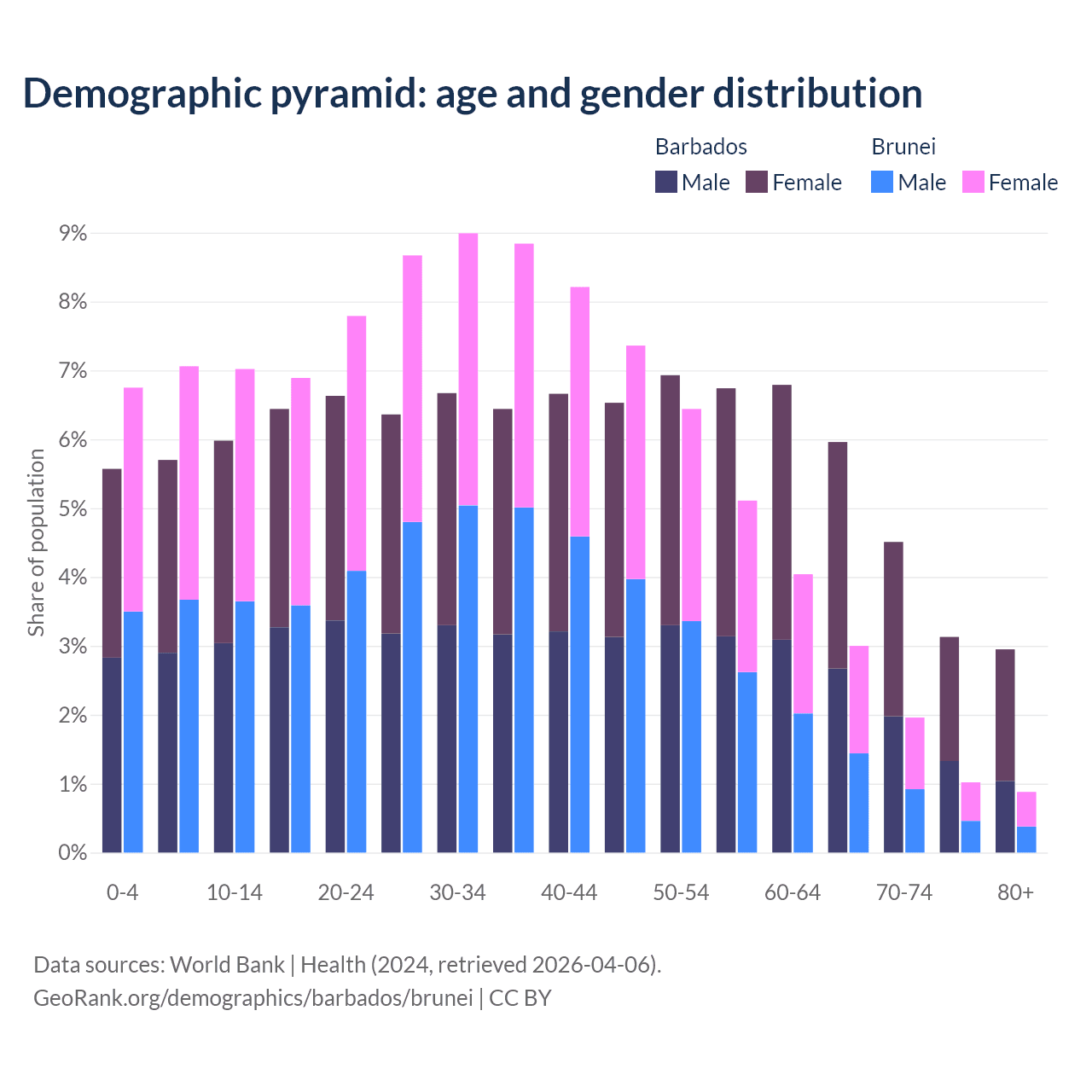 - Barbados is ranked 47/196 by median age (oldest to youngest) vs 88/196 for Brunei.