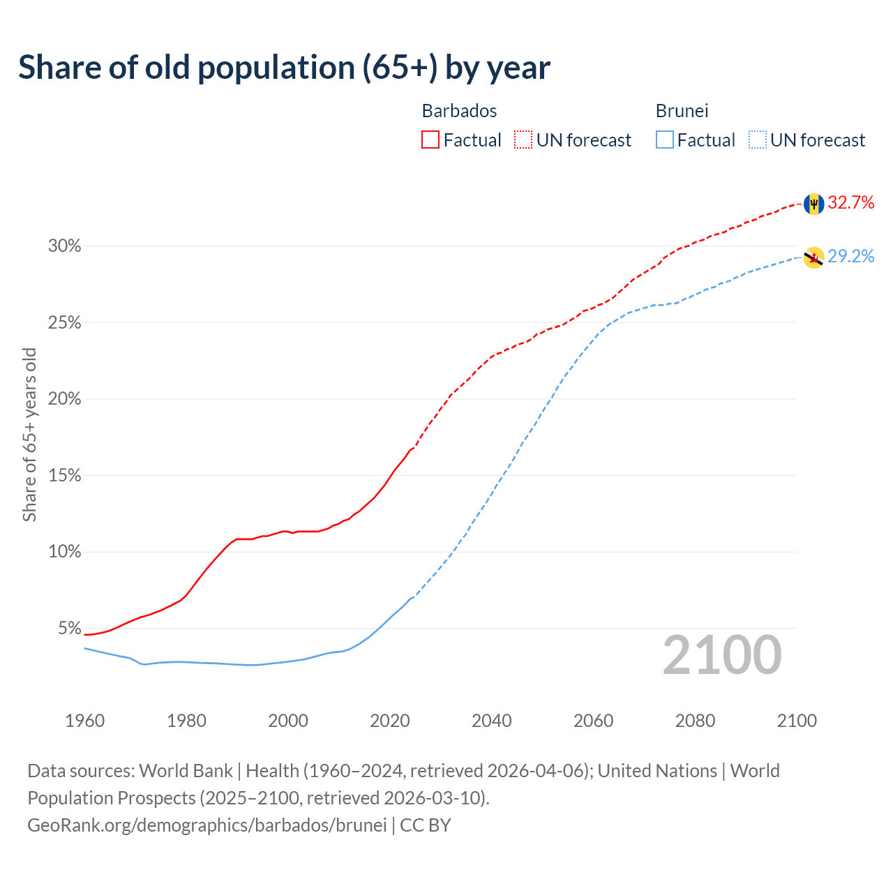 - The share of old-age demographic (65+) in Barbados is 16.6% vs 6.87% in Brunei.