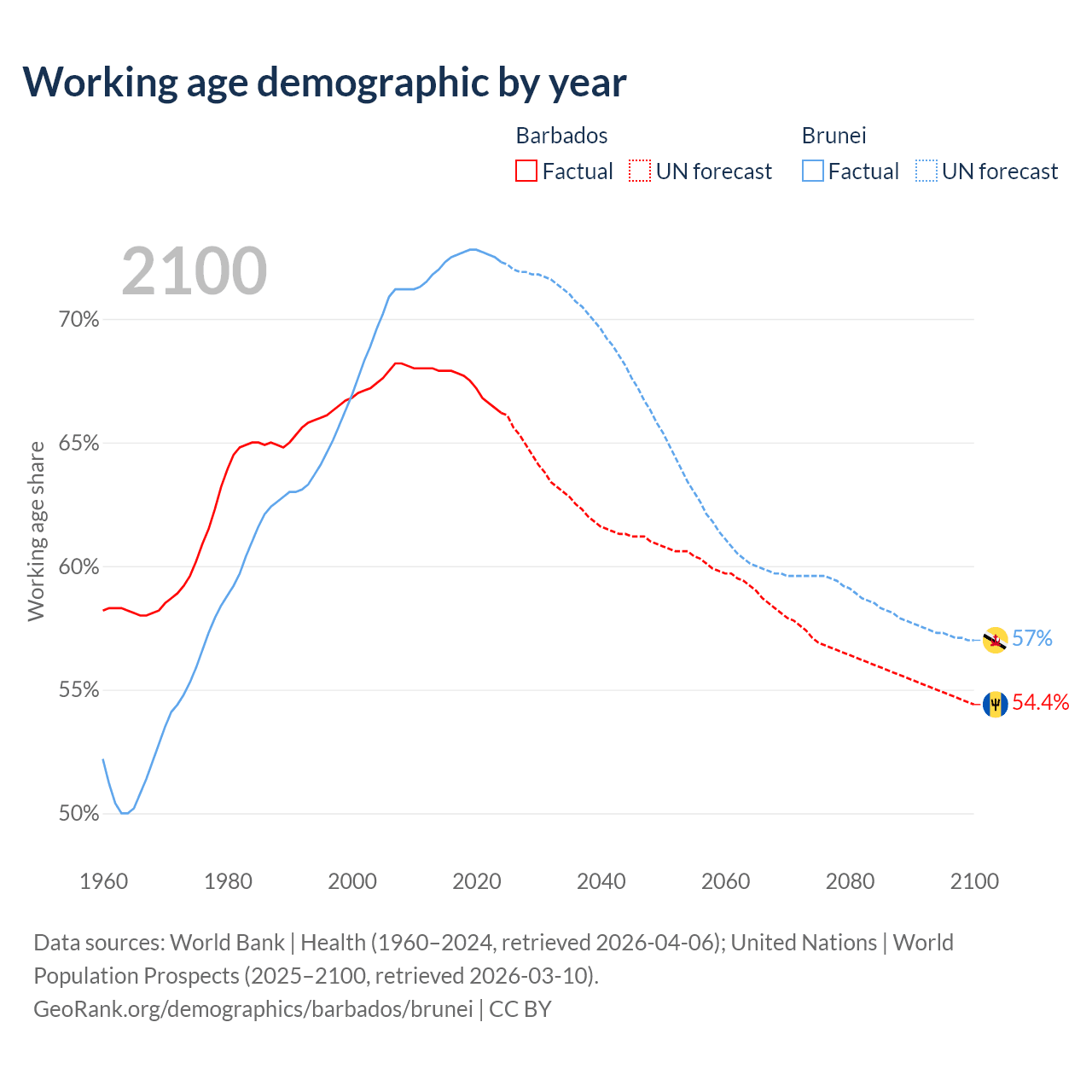 - Barbados has 187K working age adults (aged 15-64) vs 340K in Brunei.