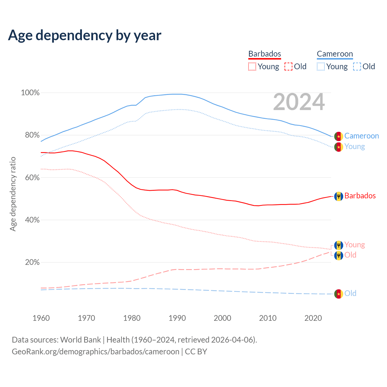 - Barbados is ranked 47/196 by median age (oldest to youngest) vs 180/196 for Cameroon.