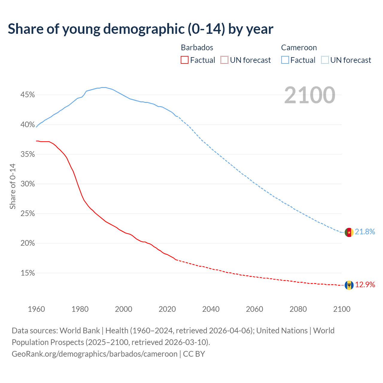 - The share of young demographic (0-15 years old) in Barbados is 17.2% vs 41.4% in Cameroon.