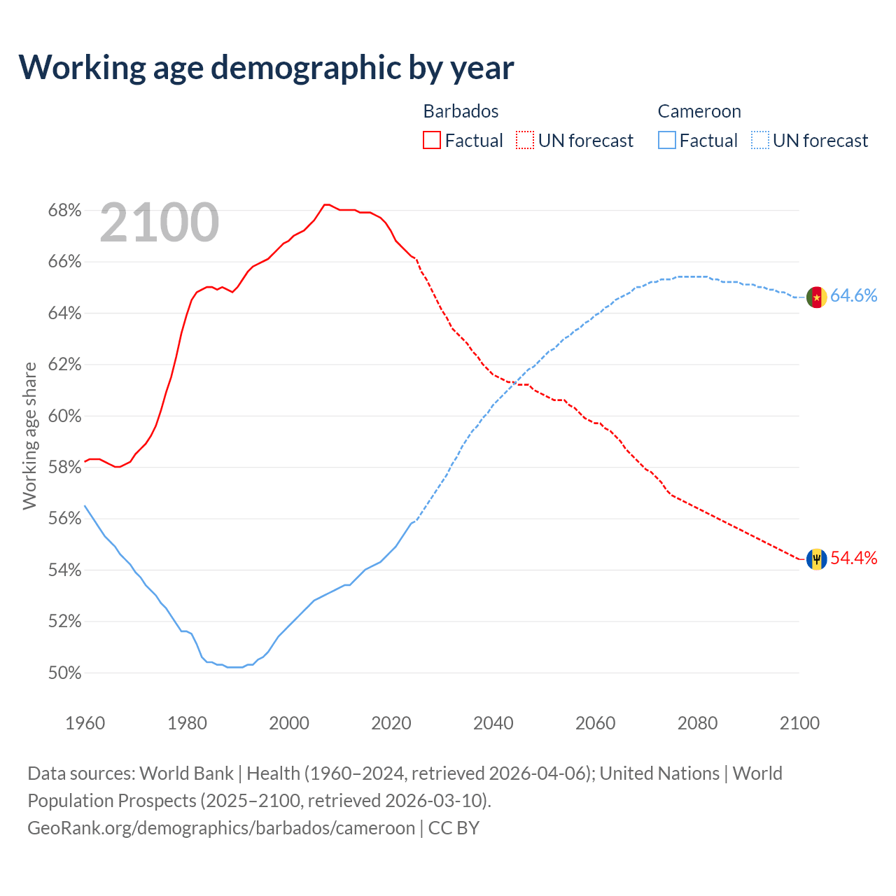Median age Barbados vs Cameroon, 1960-2100
