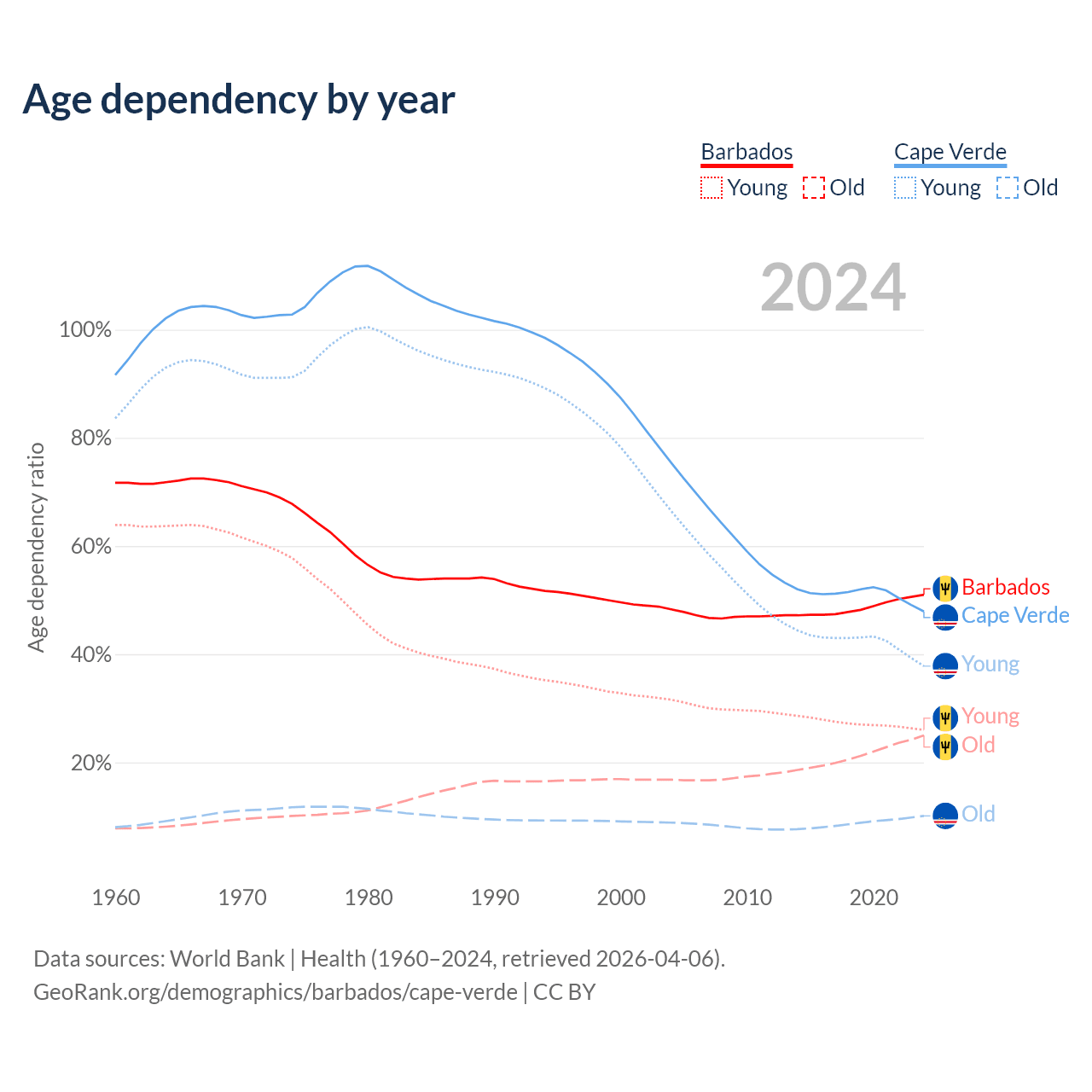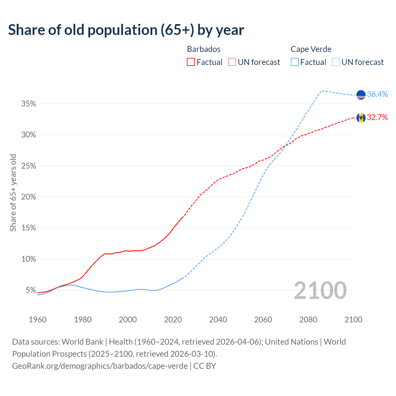 - The share of old-age demographic (65+) in Barbados is 16.6% vs 6.86% in Cape Verde.