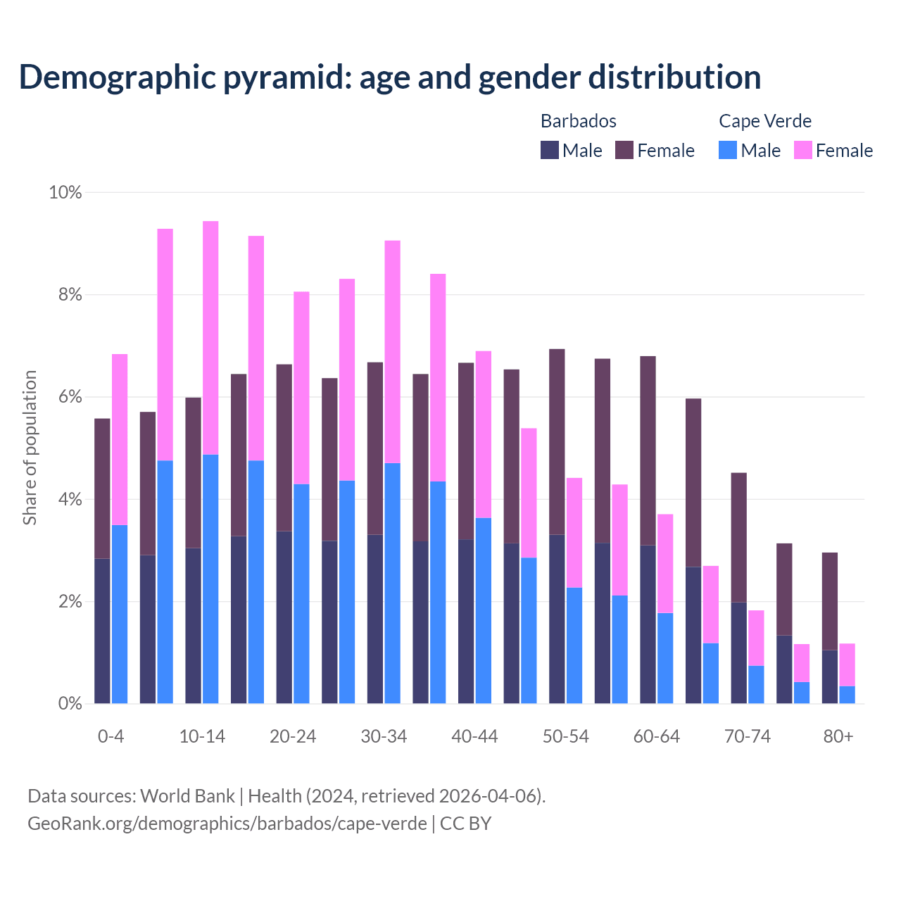 - Barbados is ranked 47/196 by median age (oldest to youngest) vs 110/196 for Cape Verde.