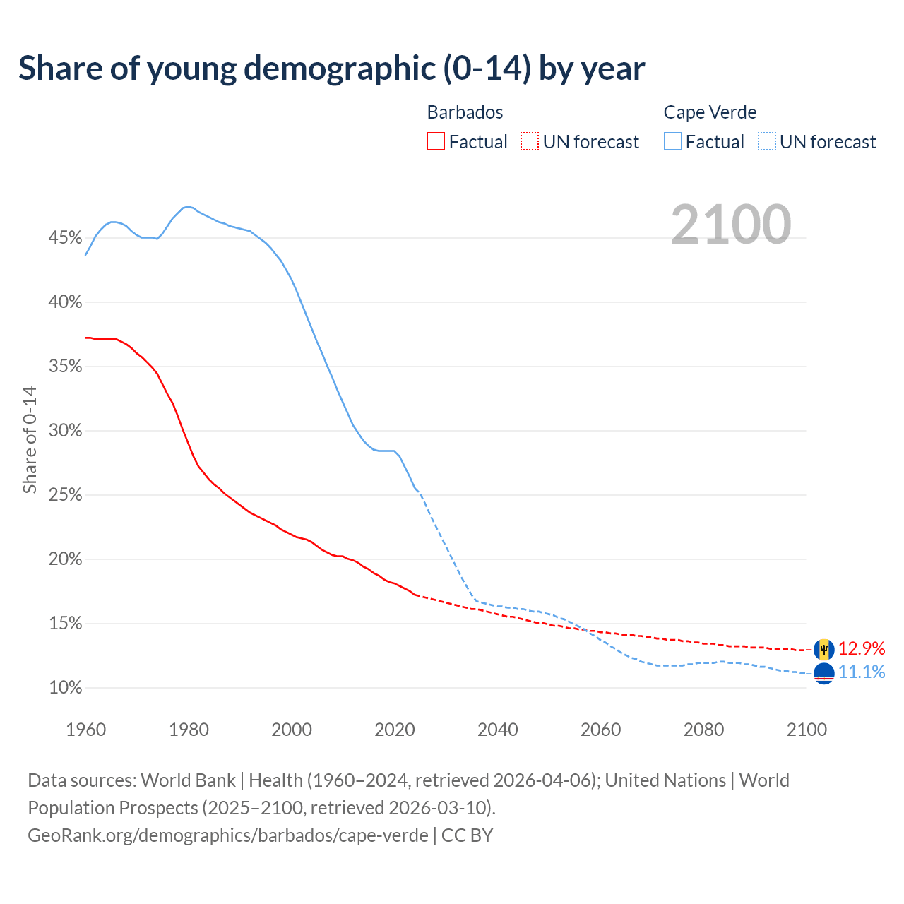 - The share of young demographic (0-15 years old) in Barbados is 17.2% vs 25.5% in Cape Verde.