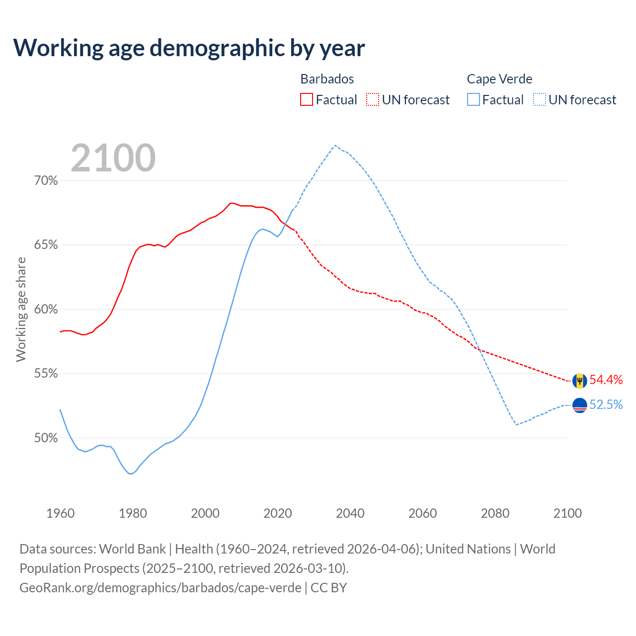 - Barbados has 187K working age adults (aged 15-64) vs 359K in Cape Verde.