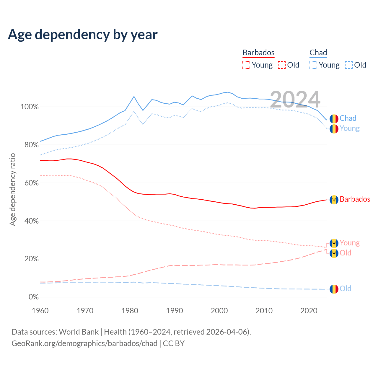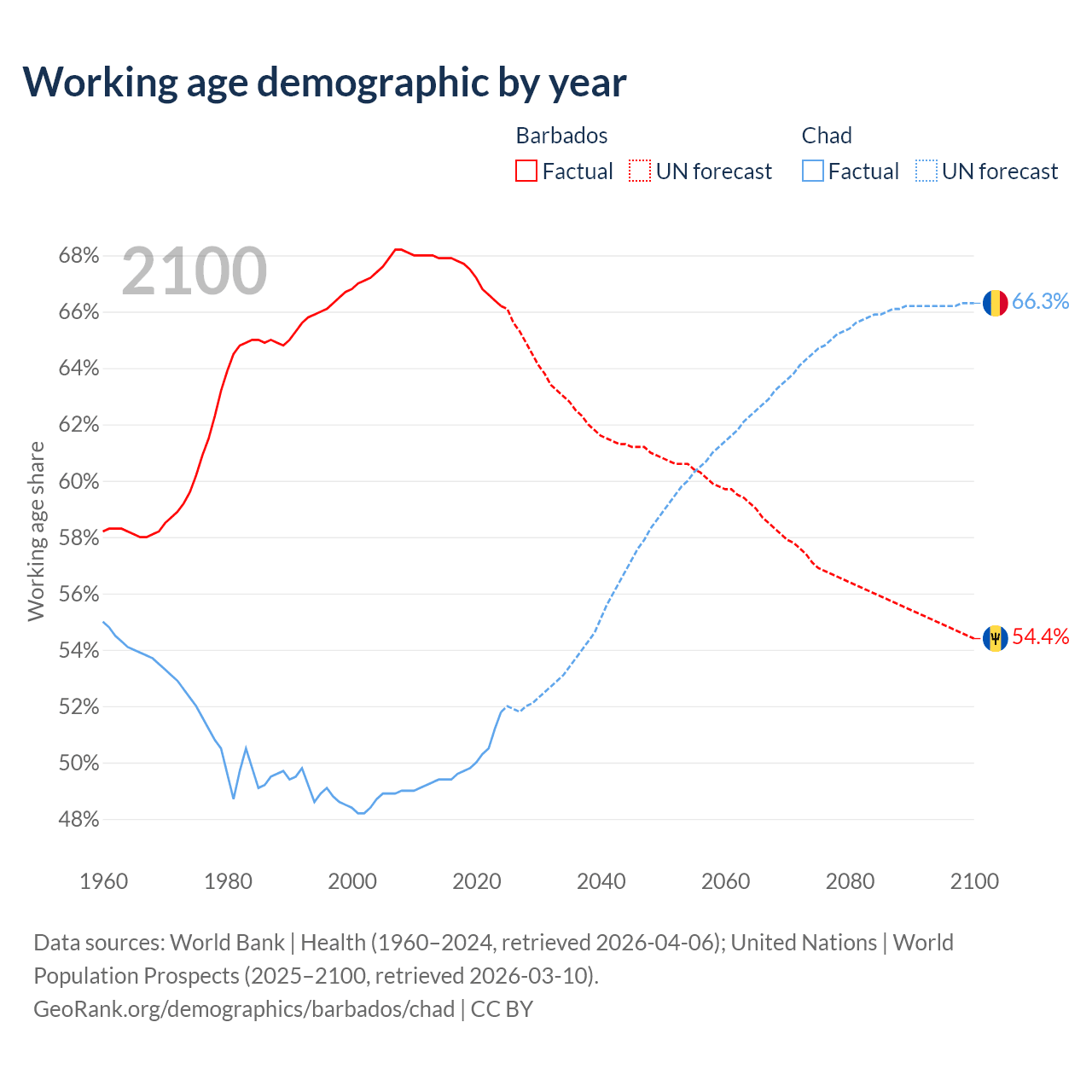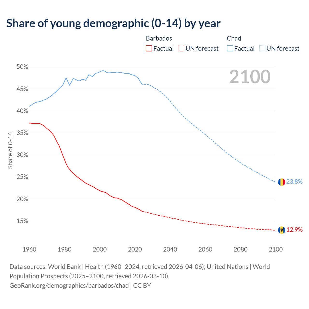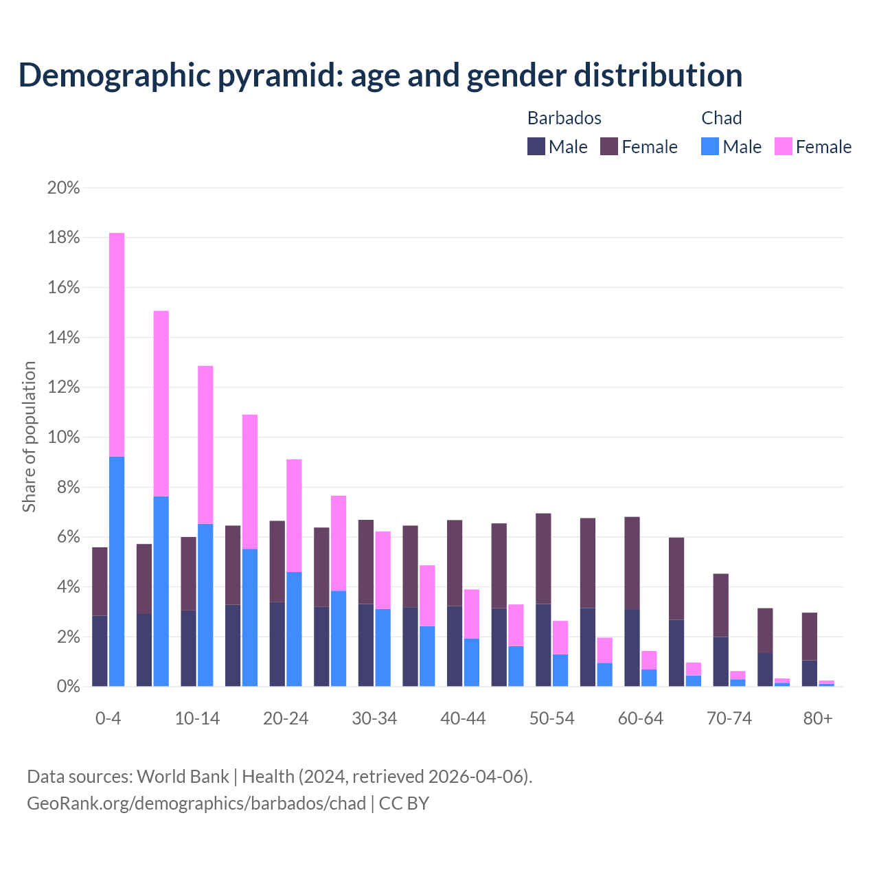 - The share of young demographic (0-15 years old) in Barbados is 17.2% vs 46.1% in Chad.