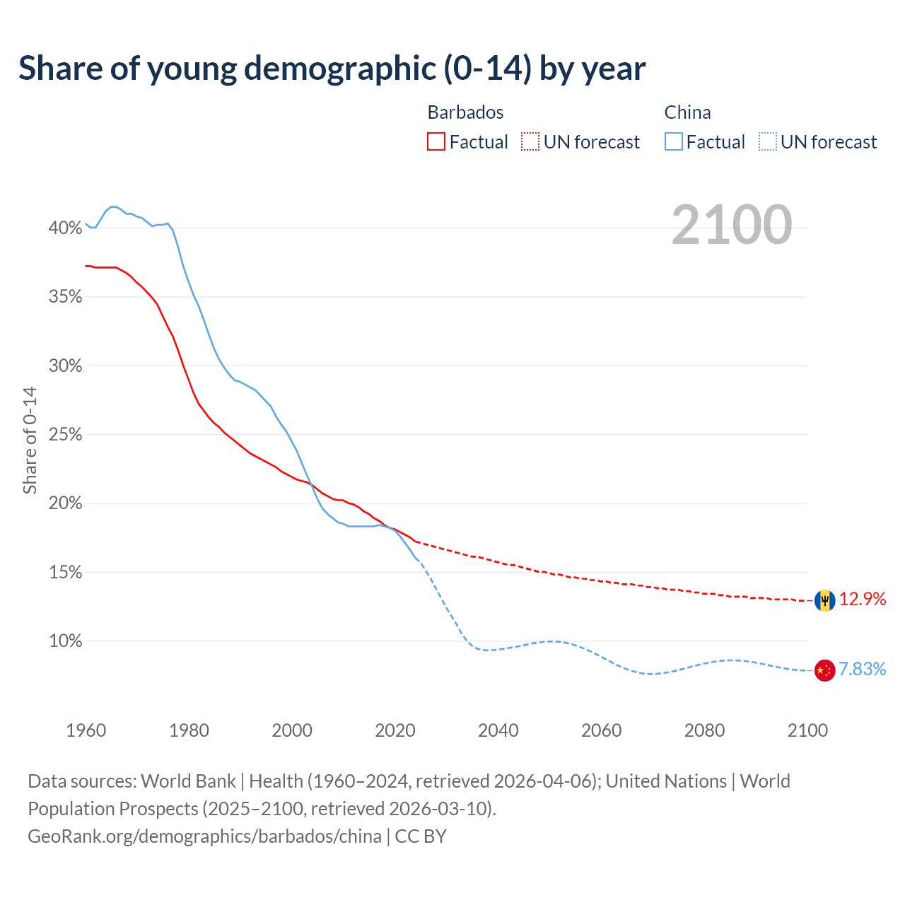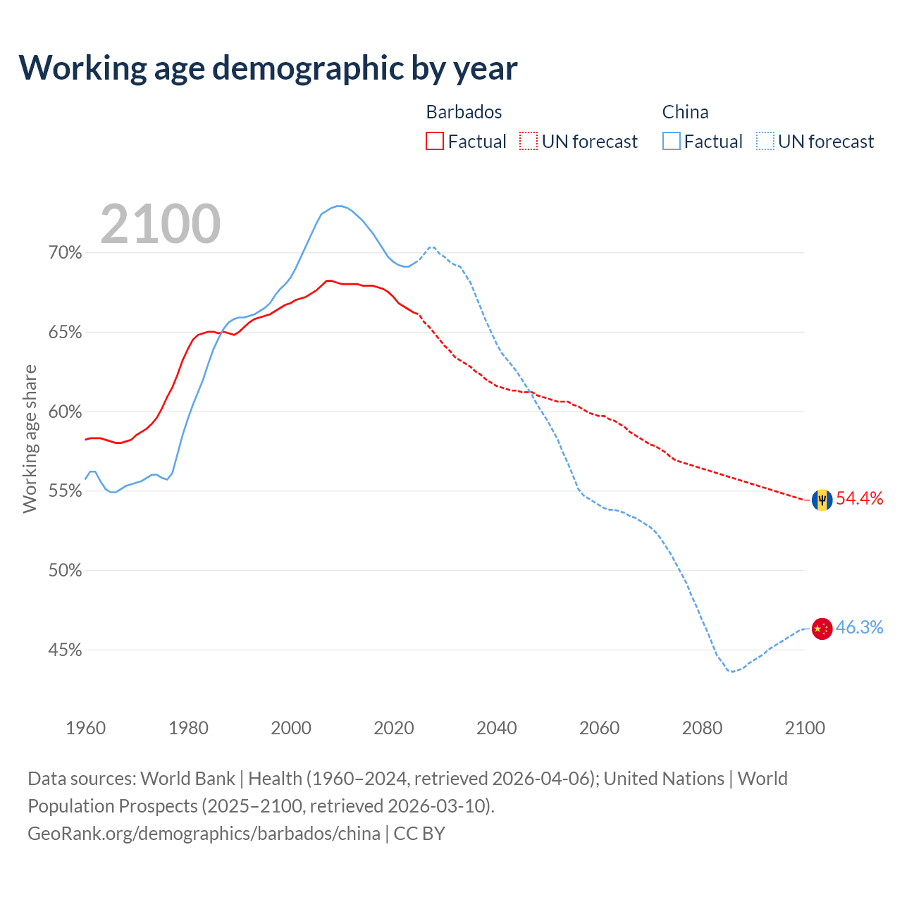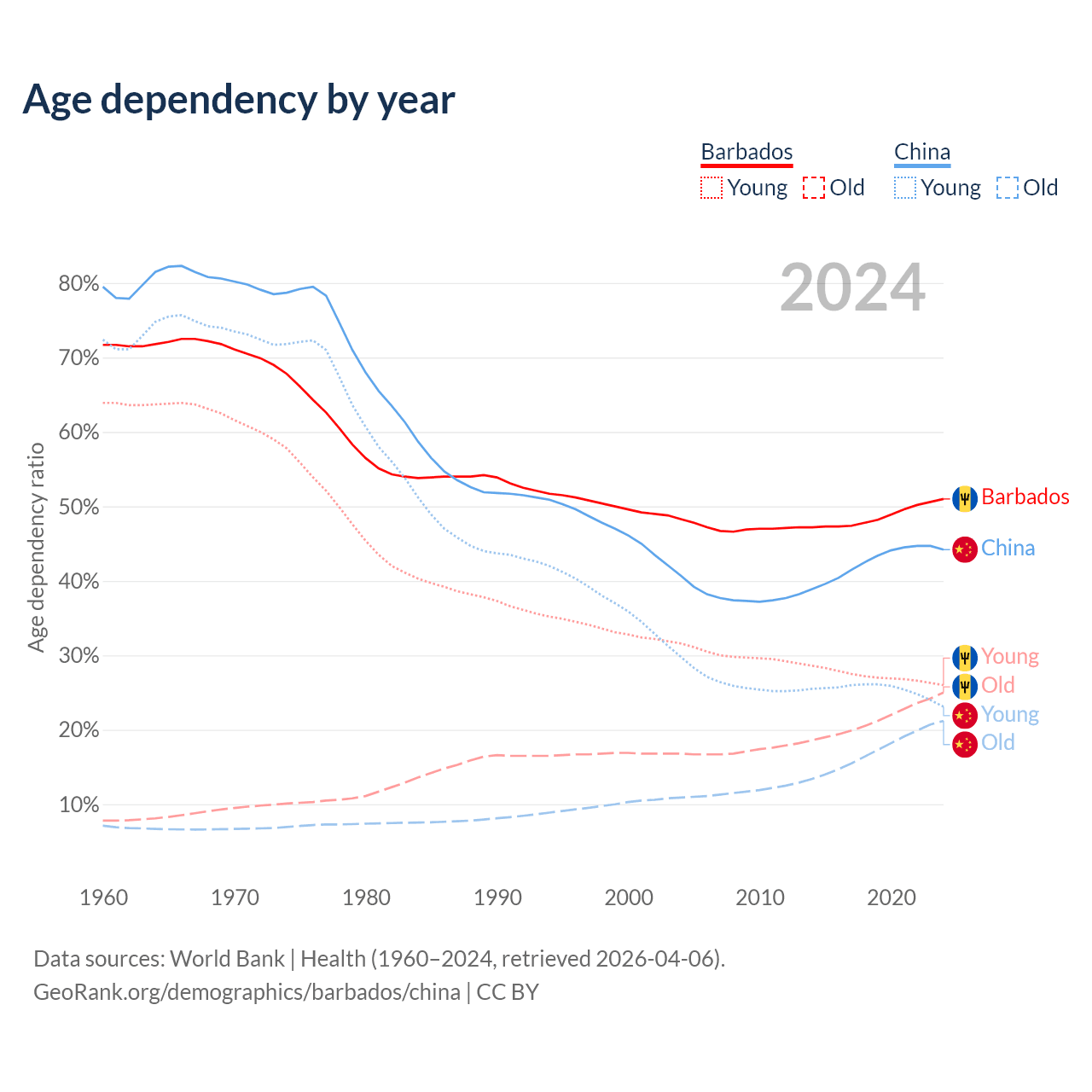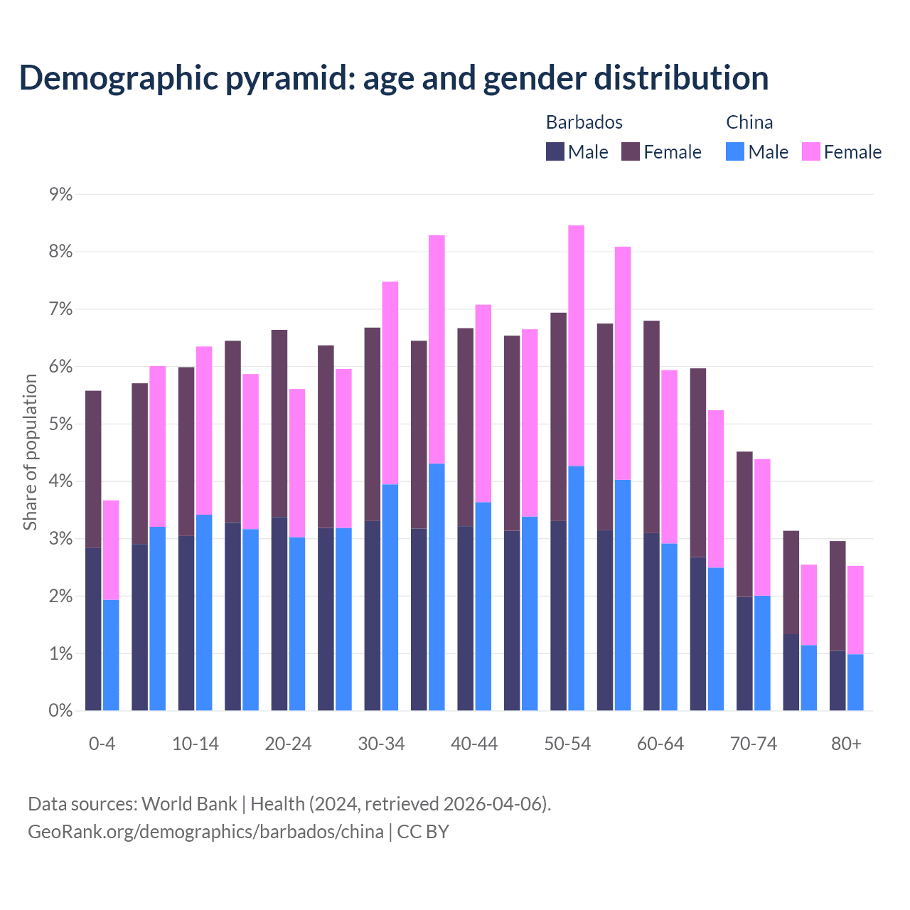 - Barbados is ranked 47/196 by median age (oldest to youngest) vs 44/196 for China.