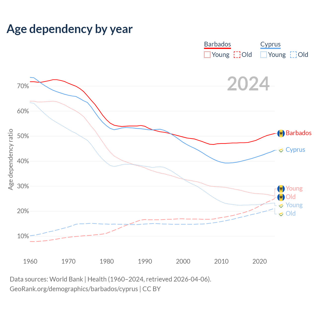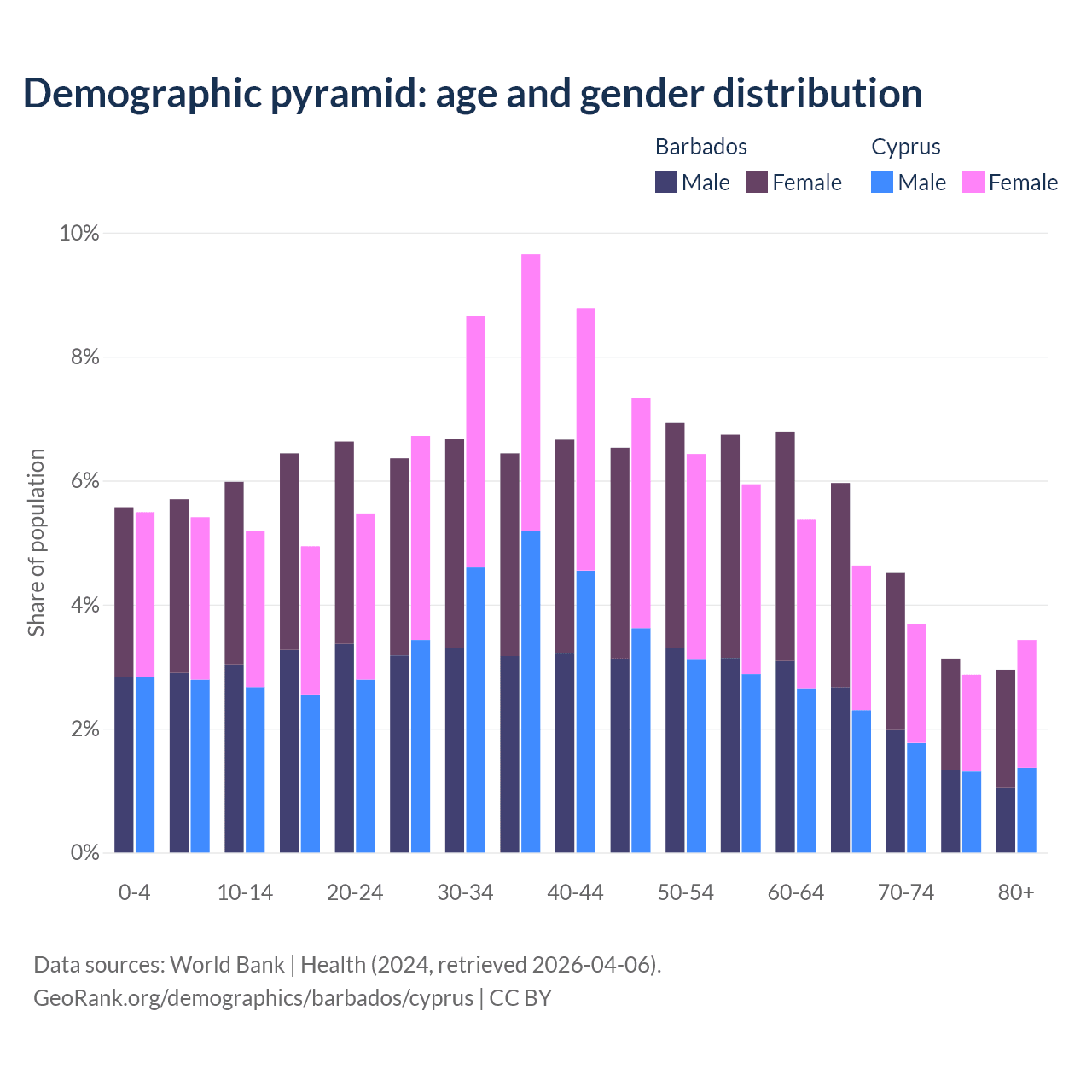 - Barbados is ranked 47/196 by median age (oldest to youngest) vs 52/196 for Cyprus.