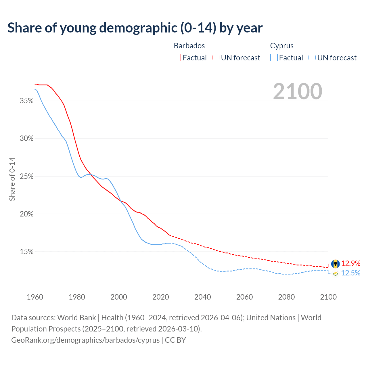 - The share of young demographic (0-15 years old) in Barbados is 17.2% vs 16.1% in Cyprus.