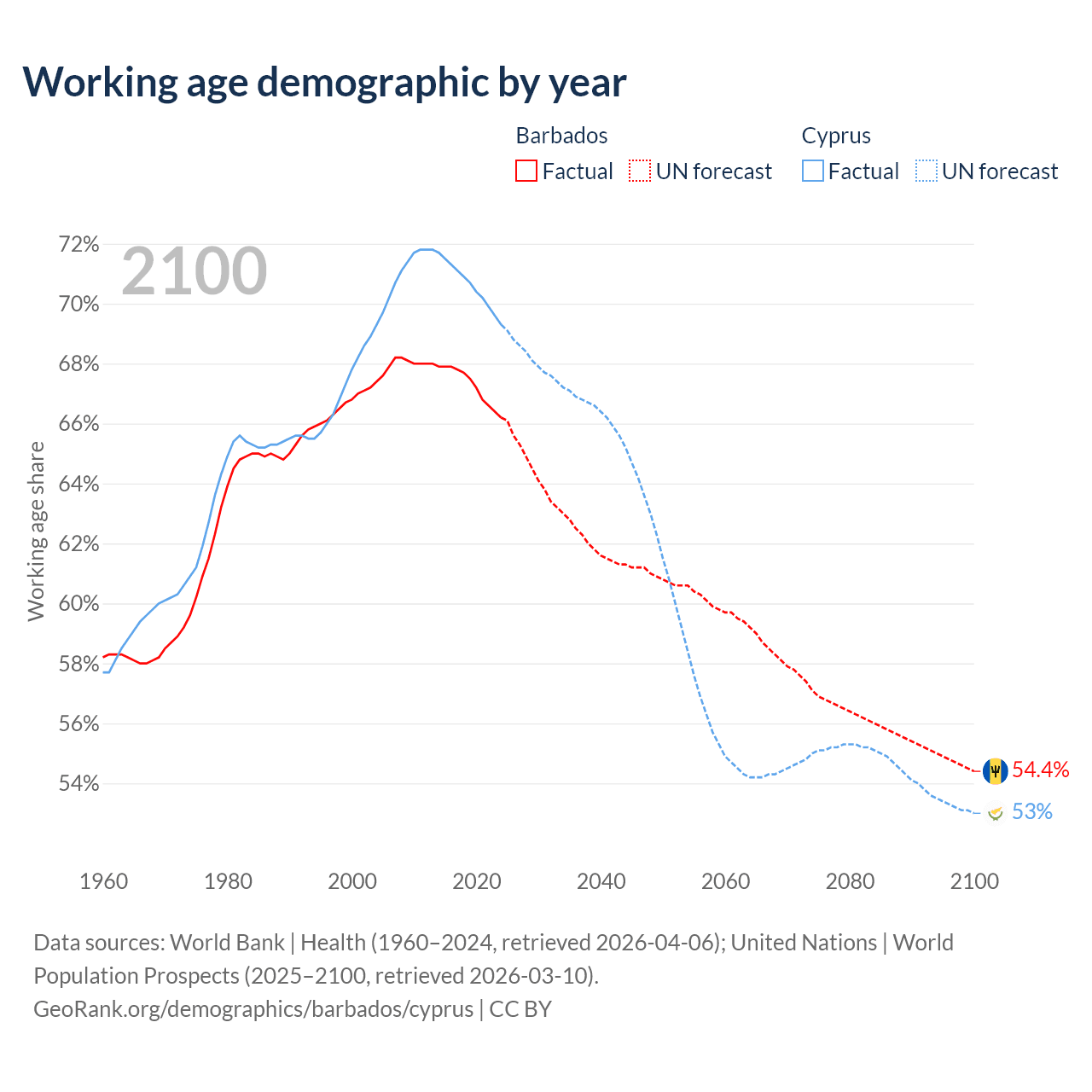 Median age Barbados vs Cyprus, 1960-2100