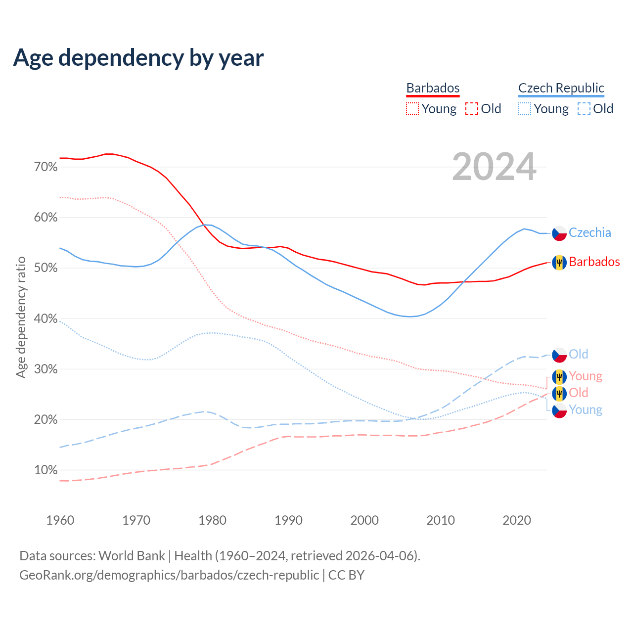 - Barbados is ranked 47/196 by median age (oldest to youngest) vs 21/196 for the Czech Republic.