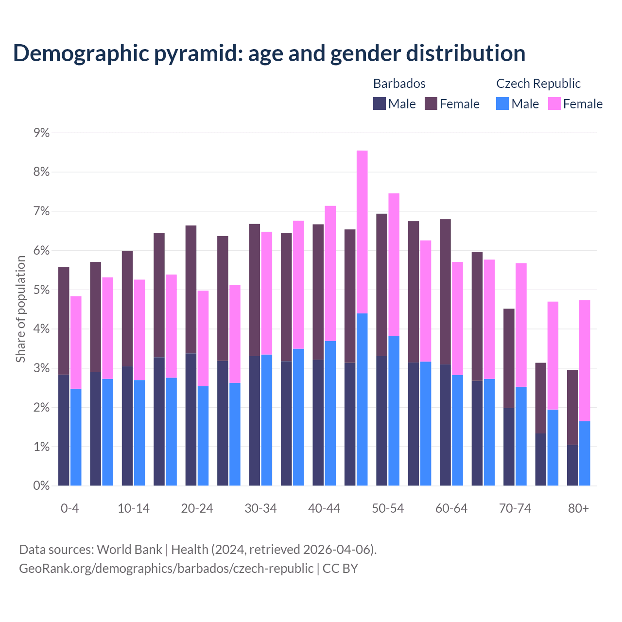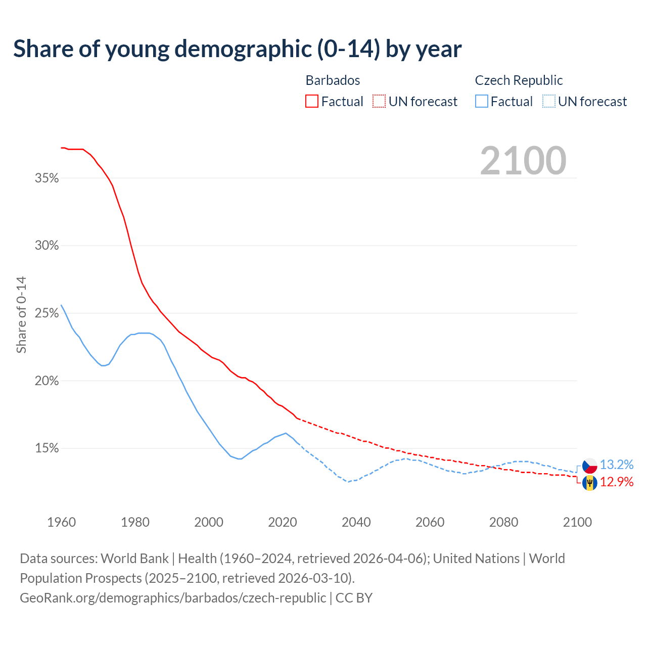 - The share of young demographic (0-15 years old) in Barbados is 17.2% vs 15.4% in the Czech Republic.