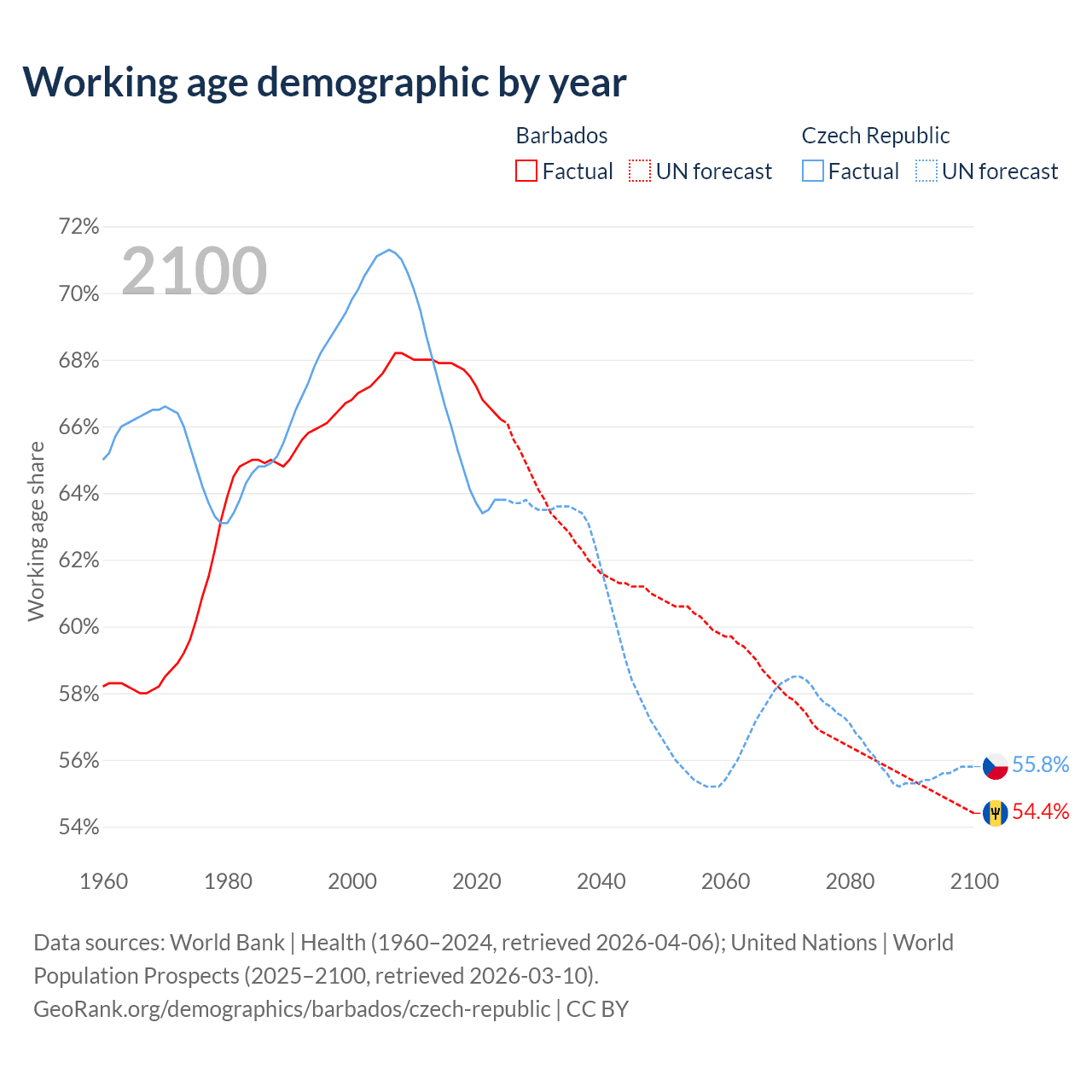 Median age Barbados vs Czech Republic, 1960-2100