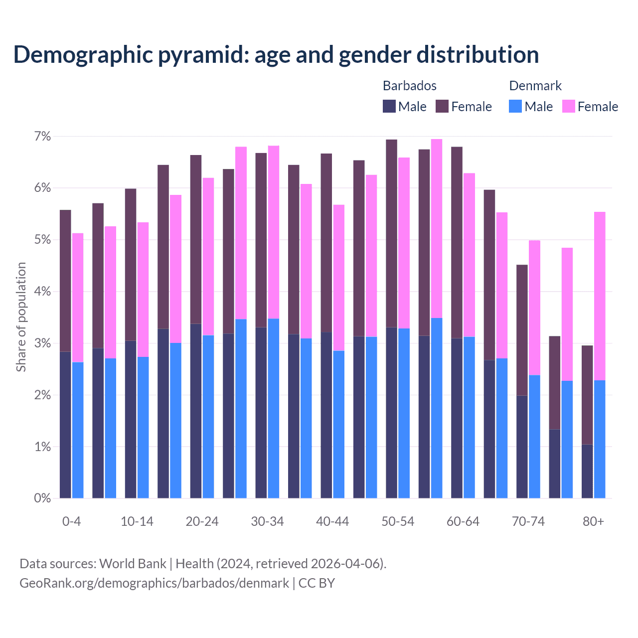- Barbados is ranked 47/196 by median age (oldest to youngest) vs 34/196 for Denmark.
