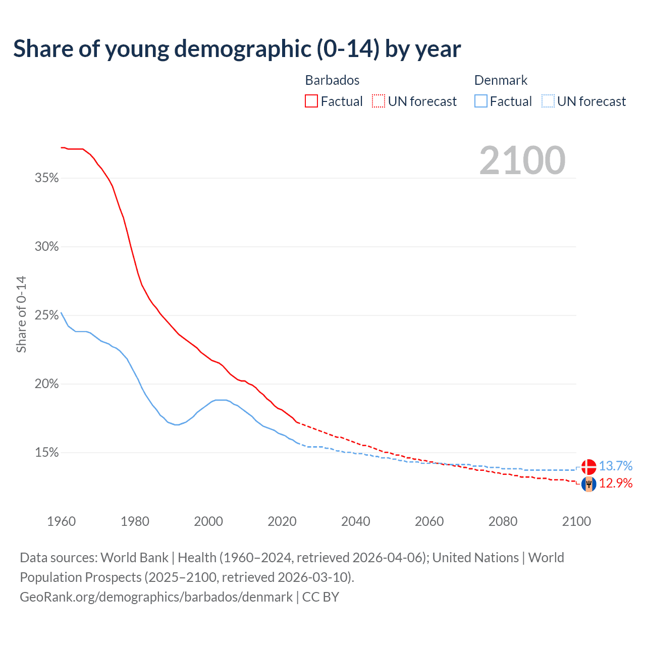 - The share of young demographic (0-15 years old) in Barbados is 17.2% vs 15.7% in Denmark.