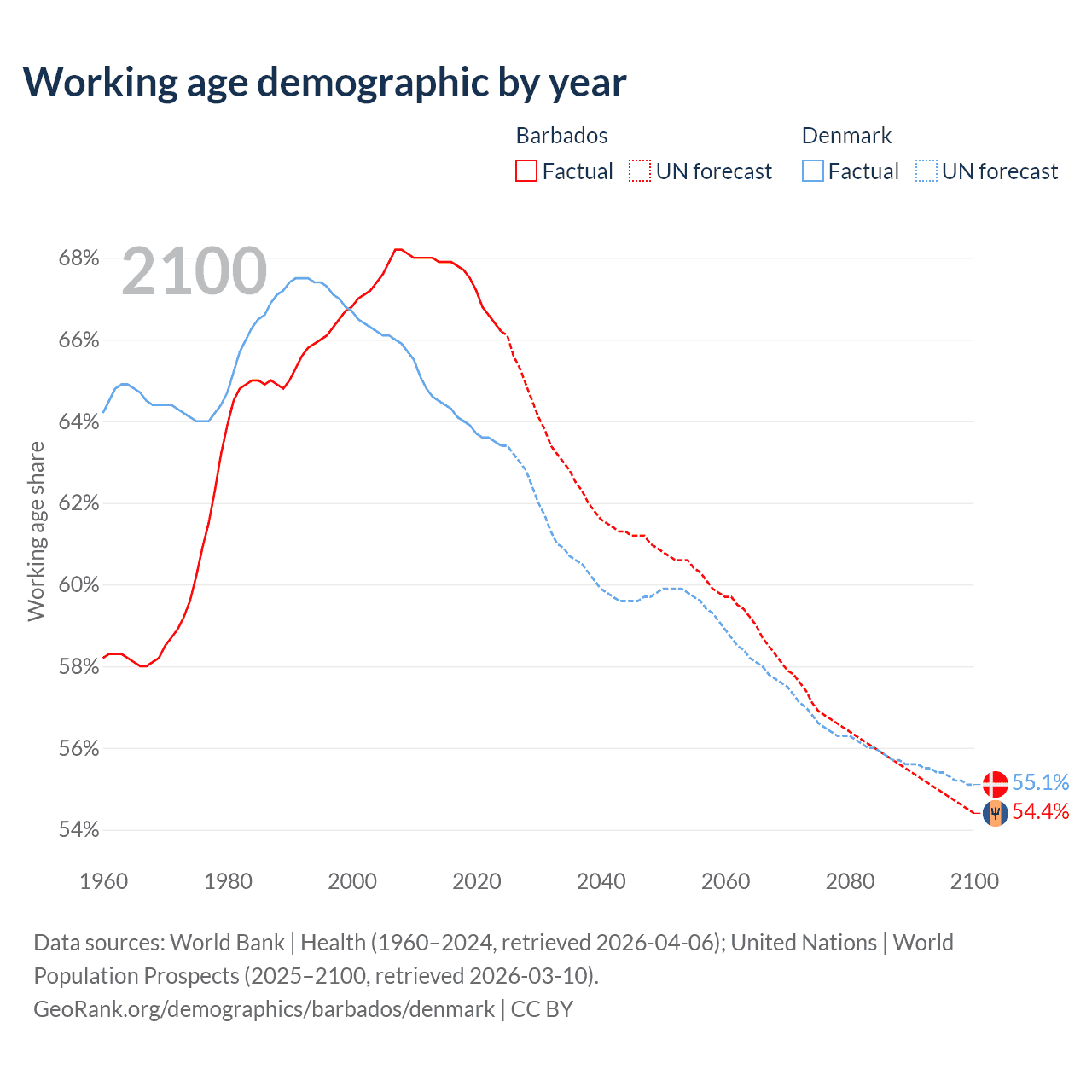 - Barbados has 187K working age adults (aged 15-64) vs 3.83M in Denmark.