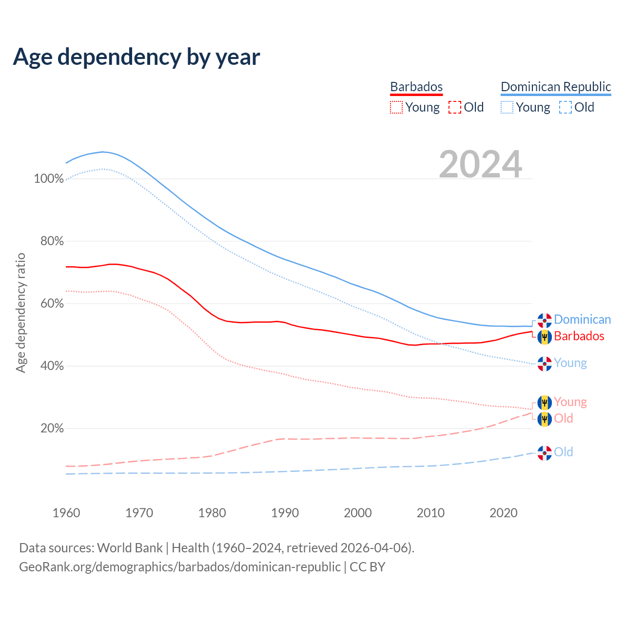 - Barbados is ranked 47/196 by median age (oldest to youngest) vs 112/196 for the Dominican Republic.